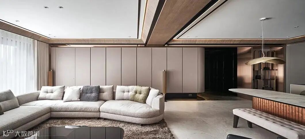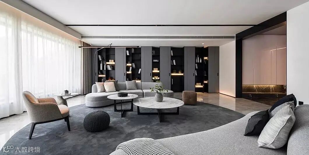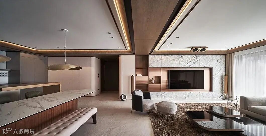 客厅的功能主要有招待客人、视听和阅读,环境光只需均匀照亮整个区域即可,无需太过强烈,采用分散光源能更好地调节空间亮度。