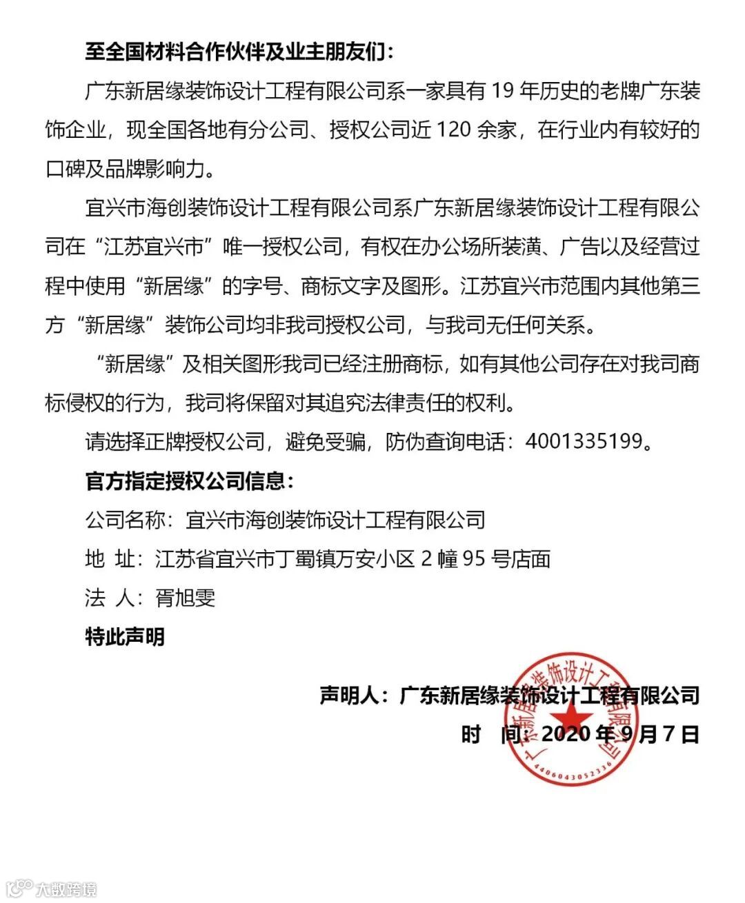官宣 | 关于对宜兴市海创装饰设计公司的品牌授权声明