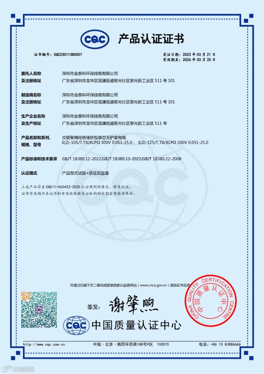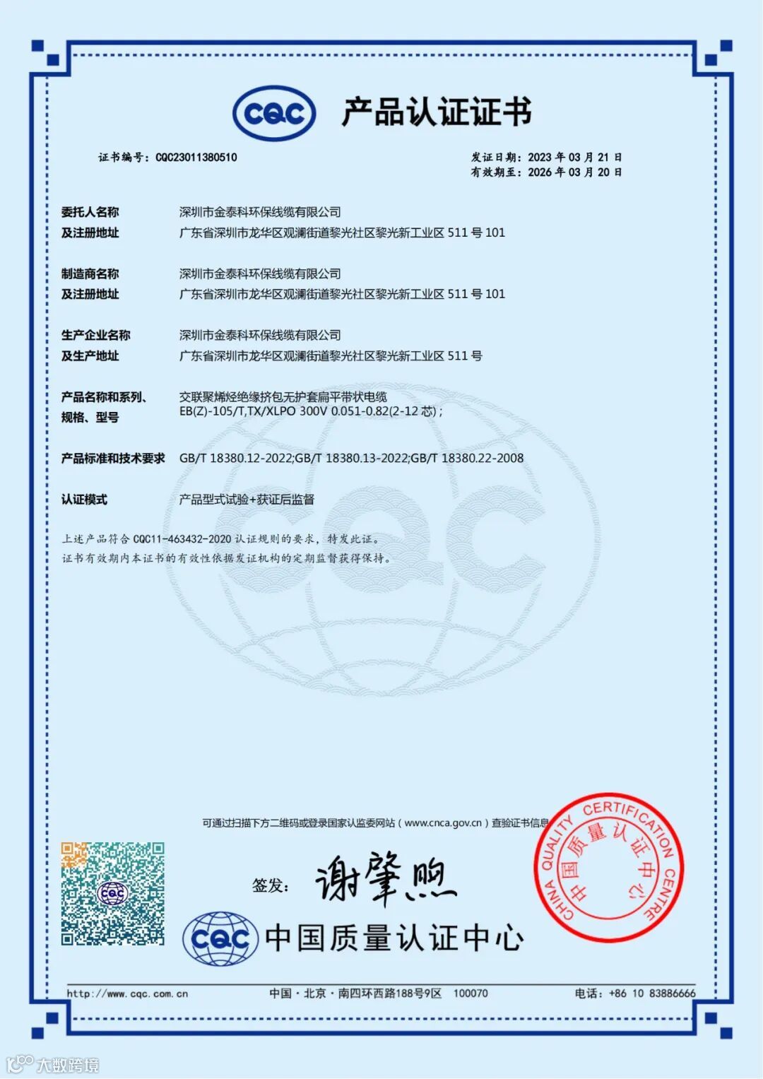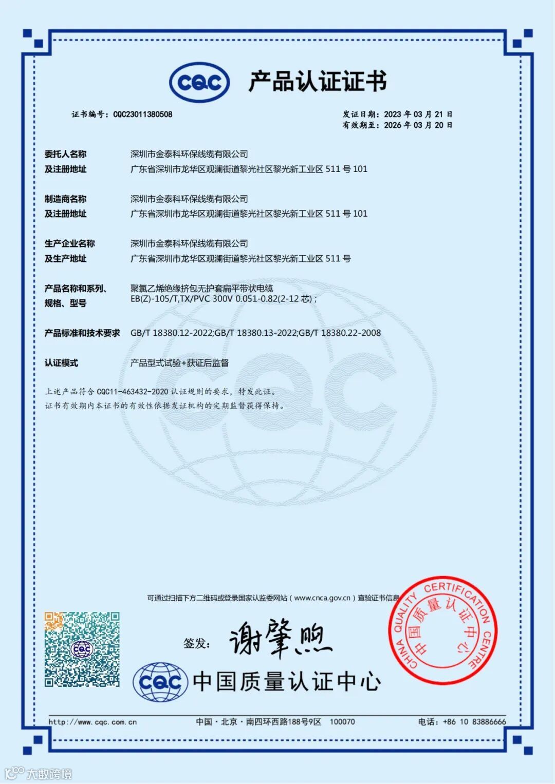 我司电子线类产品顺利通过CQC认证