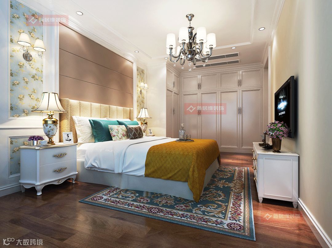 床头两侧蓝底花纹壁纸映衬着床头灯饰,绽放出温和的浪漫,淡粉色壁柜更添卧房的柔和与温馨,造型优雅复古,皮质床头装饰显空间上乘质感。