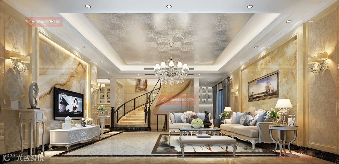 客厅以金黄色调融合银白为主调铺展,视野通透,缔造出典雅的现代格局,经典欧式家具造型奢华而雅致,在银箔天花与水晶吊灯的映衬下光韵流转,从容呈现着高贵的气质。
