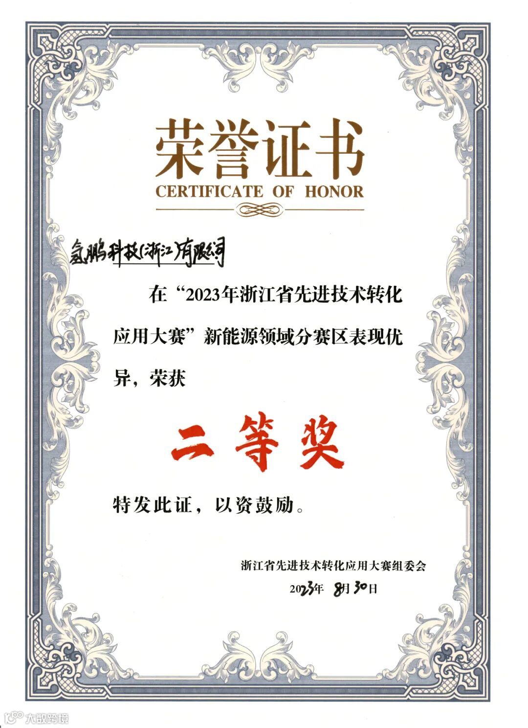 喜讯 氢鹏科技2023年浙江省先进技术转化应用大赛中获分赛区二等奖