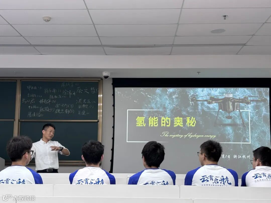 在开营仪式结束后,天目氢鹏负责人徐伟强教授为同学们带来了暑期实践的第一课 ——《氢能的奥秘》。徐教授以丰富的知识和生动的案例,系统地讲解了氢气与无人机的历史渊源,深入剖析了氢能无人机的应用场景,包括水利巡检、石油天然气管线巡查等。在这些场景中,氢能无人机凭借其超长续航、低温适应性强等优势,能够大大提升作业效率和覆盖范围。同时,徐教授还对氢能无人机的市场需求、未来发展趋势以及技术变革进行了分析,让同学们了解到该领域的巨大潜力以及面临的挑战。同学们全神贯注地聆听,相信这堂课激发了他们对氢能技术的浓厚兴趣,也为后续参与相关实践项目指明了方向。
