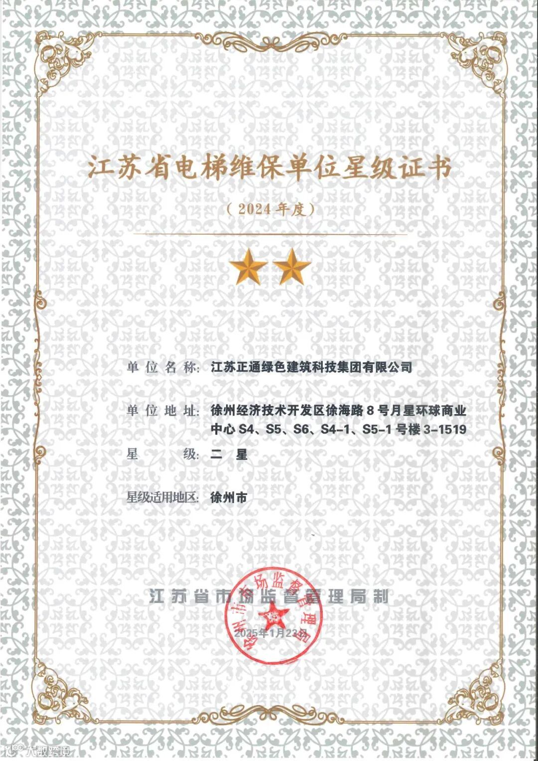 近日,正通集团荣获了由江苏省市场监督管理局颁发的2024年度电梯维保单位“二星”证书。