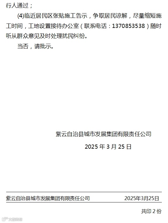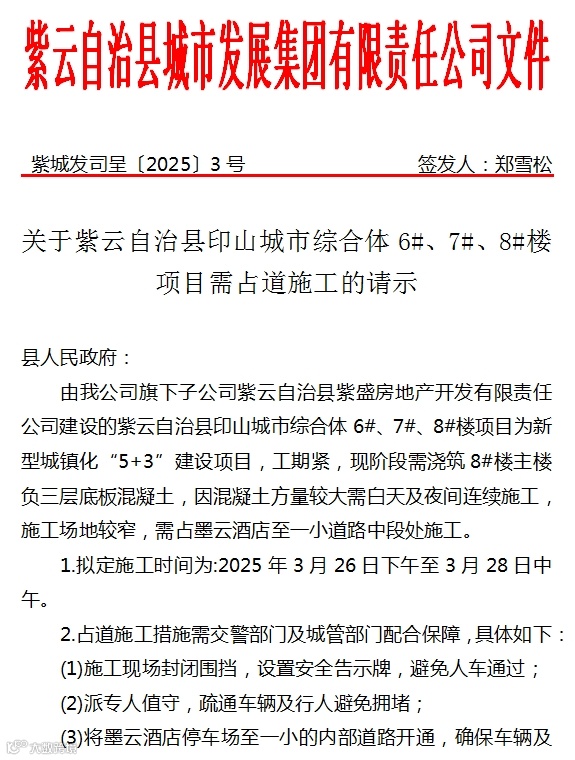 导读:关于紫云自治县印山城市综合体6#、7#、8#楼项目需占道施工的请示