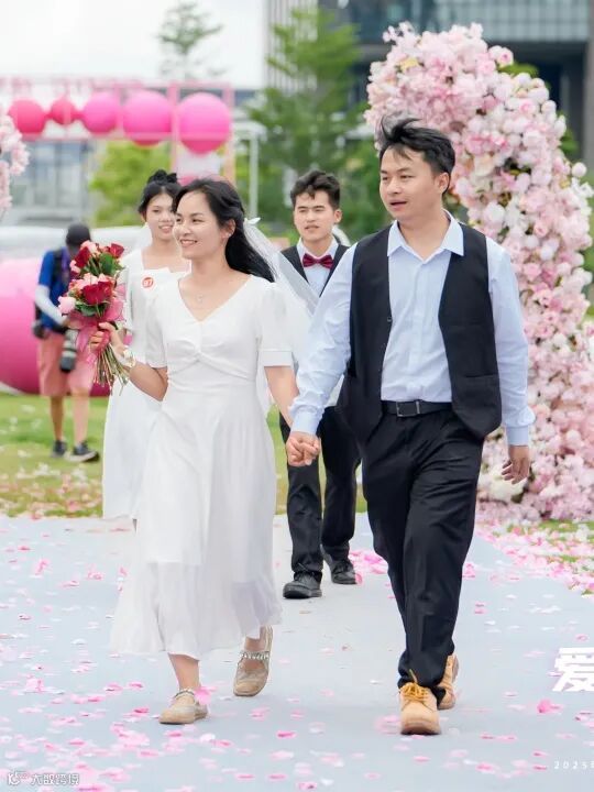 活动现场同步举办了主题游园活动,设有照片墙展示区、互动游戏区等区域,让平日辛勤劳作的环卫工人们得以放松身心、共享欢乐,同时设置了告白留声机、合影留念等游园互动环节,为百对环卫夫妇记录下珍贵瞬间。这场融合仪式感和趣味性的活动,成为激励他们继续携手前行的温暖力量。