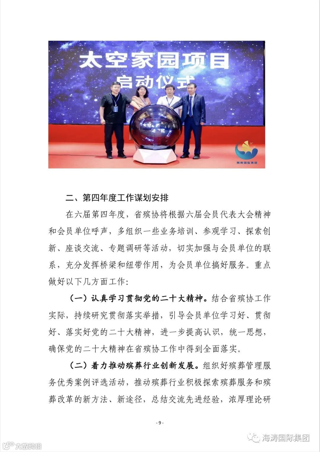 河北省殡葬行业协会 王六一会长将太空家园列入河北省殡葬行业协会第六届第三年度工作报告中。太空家园这种不占用土地且不破坏生态环境的新型葬法符合国家民政部等九部委《关于推行节地生态安葬的指导意见》,符合百姓追寻“天堂梦”的祈愿,是殡葬改革大潮中的耀眼星辰。
