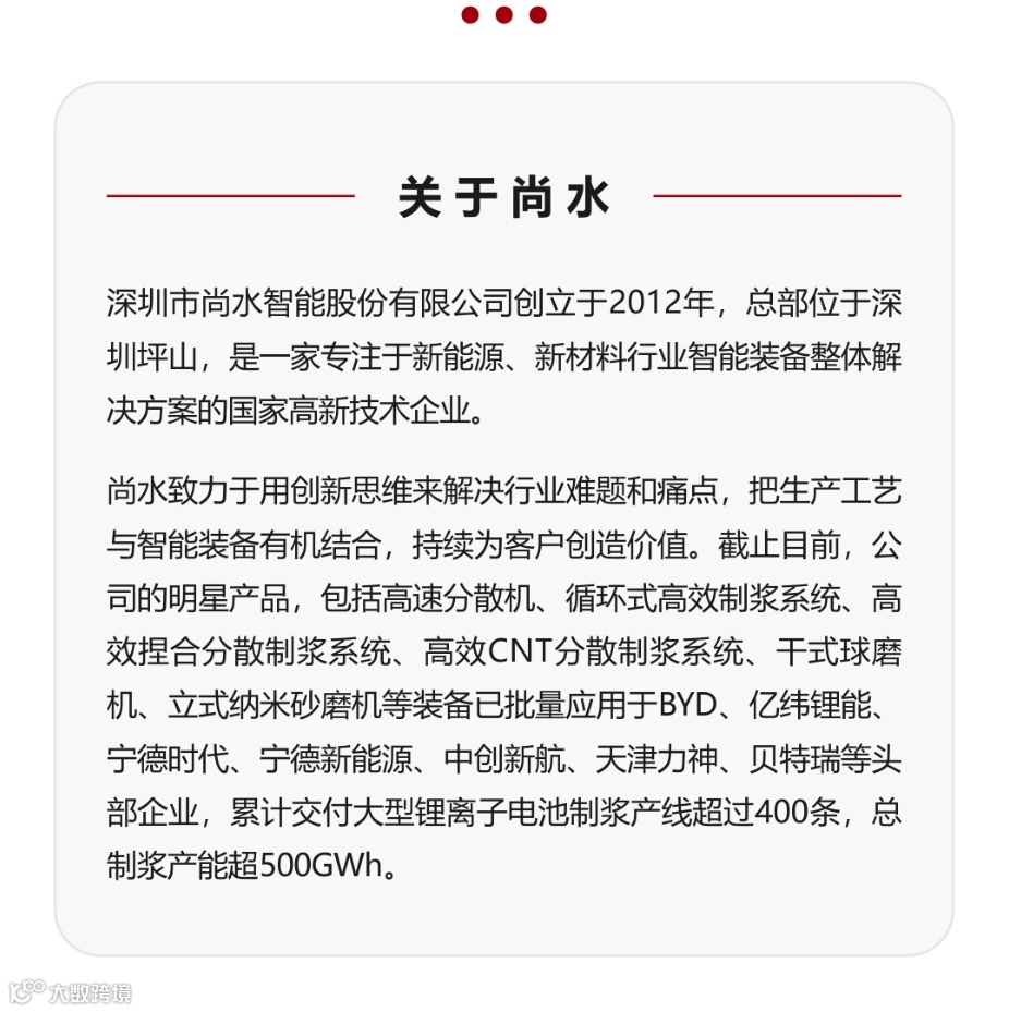 11年的探索与奋进,尚水智能不断超越自我,持续以创新为客户赋能!为全球客户智造一流新能源、新材料装备,提供更智能、更高效、更环保的一站式整体解决方案,是尚水智能不变的信念和承诺!