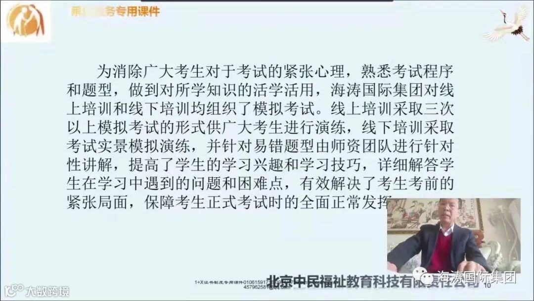 北京中民福祉教育科技有限公司副总经理、北京社会管理职业学院民政部培训中心副教授刘利君老师对1+X证书制度相关工作部署做了介绍,并宣读了2021年度社会福祉领域养老、社区、婚姻、殡葬1+X证书制度试点工作58个示范院校、90个优秀院校、7个优秀省级培训基地名单。海涛国际集团被评为2021年度优秀省级培训基地。