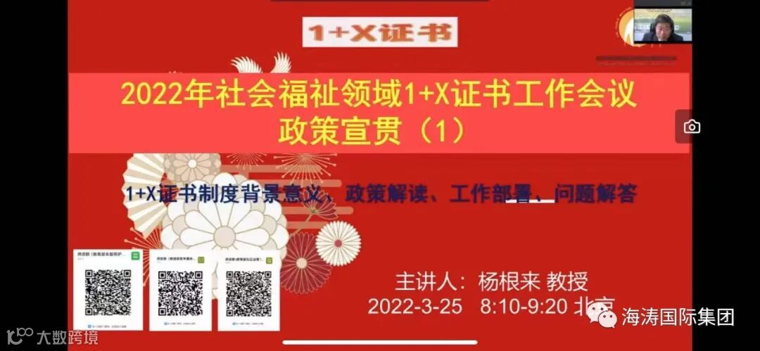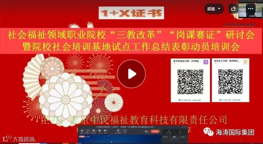 2022年3月25日,社会福祉领域职业院校“三教改革”“岗课赛证”研讨会暨院校社会培训基地试点工作总结表彰动员会在线上召开,会议邀请了各试点工作院校、企业、行业和社会知名领导、学者和优秀代表,海涛国际集团作为1+X证书制度优秀省级培训基地参加了本次会议。