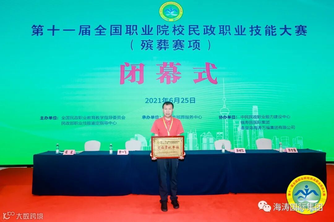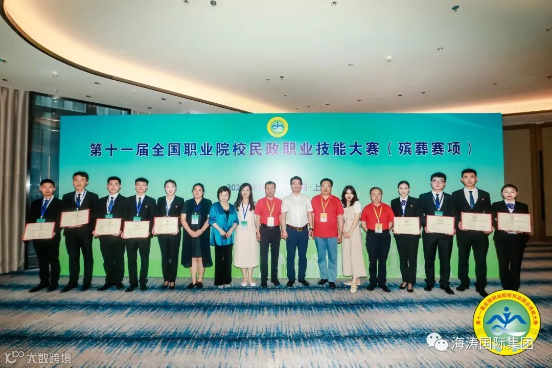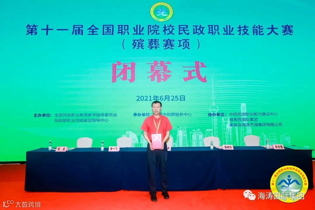 第十一届全国职业院校民政职业技能大赛殡葬类职业技能竞赛于2021年6月23日在上海开幕,6月25日隆重闭幕。全国民政职业教育教学指导委员会秘书长、民政部职业技能鉴定指导中心副主任赵红岗,上海市民政局副局长曾群出席开幕式并致辞。上海市民政局殡葬管理处处长黄一飞、上海市殡葬服务中心主任程坚,以及各参赛队领队、指导老师和选手、竞赛主办单位、承办单位、协办单位等有关人员共有200余人参加开幕式。民政部职业技能鉴定指导中心办公室负责人周世强,上海市民政局殡葬管理处处长黄一飞,大赛专家组长、总裁判长肖成龙,全国民政行职委殡葬专职委主任委员孙树仁,上海市殡葬服务中心主任程坚出席闭幕式。各参赛队领队、指导教师、选手及有关领导参加闭幕式。经过3天激烈的角逐,大赛共产生团体一等奖1个、二等奖1个、三等奖2个、优秀组织奖3个;36名参赛选手获得个人奖,其中一等奖6名、二等奖12名、三等奖18名。
