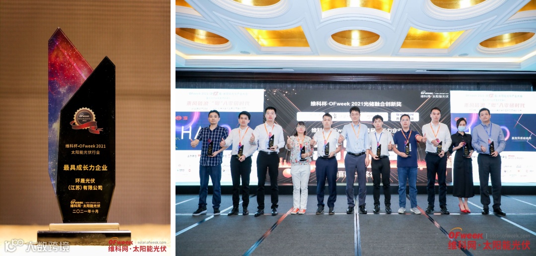 2021年10月21日,第十二届2021 OFweek太阳能光伏产业大会暨光伏行业年度颁奖典礼在深圳福田大中华喜来登酒店隆重举办。作为全球领先的高效叠瓦组件制造商,环晟光伏凭借卓越的创造发展力,开拓创新的核心竞争力,突出的企业“生命体”活力,荣膺“最具成长力企业”奖项。这一殊荣,充分体现了OFweek对环晟光伏在高效光伏技术产业化领域突出成绩给予的肯定,也是业内对环晟光伏资源优势与机能成长性认可的最佳体现。
