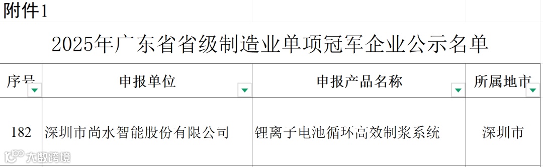 近日,广东省工业和信息化厅发布了《关于2025年广东省省级制造业单项冠军企业及第一批复核企业通过名单的公示》。尚水智能凭借自主研发的“锂离子电池循环高效制浆系统”成功入选。