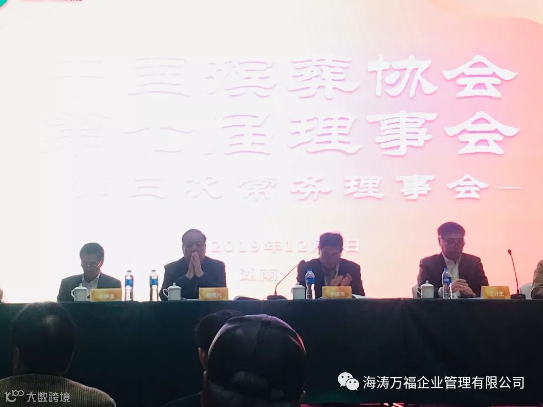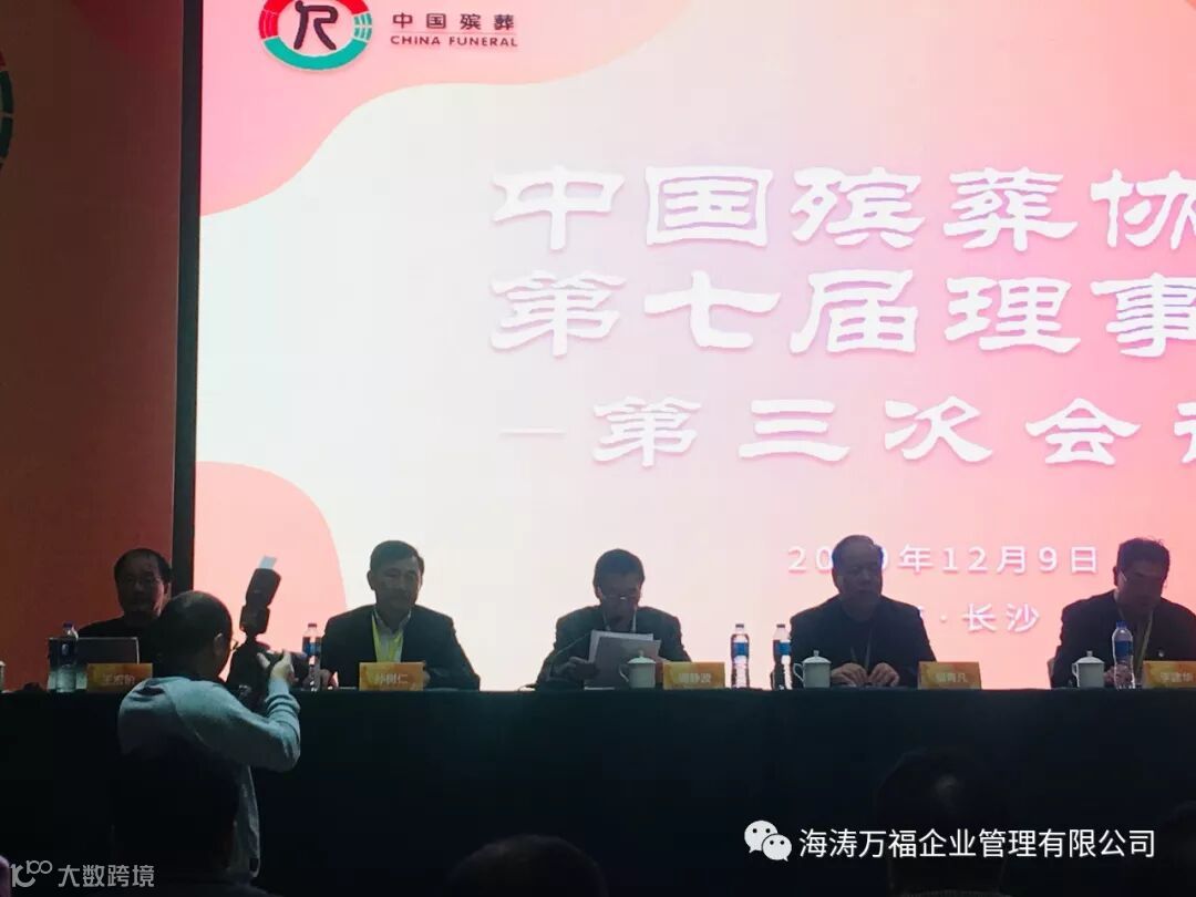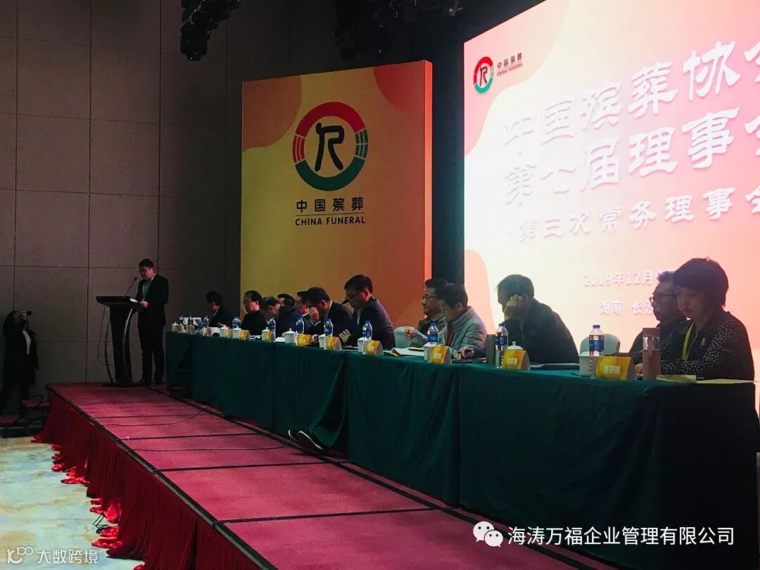 2019年12月9日,中国殡葬协会第七届理事会第三届常务理事会在湖南省长沙市召开。会长李建华、副会长王计生、林军、郭青凡、周静波、陈景莲、监事长曹丽娟、秘书长孙树仁、原天津市民政局副巡视员王光华、协会顾问杨世森、王宏阶、袁家骧、以及协会理事单位代表共300余人参加会议。中国殡葬协会常务理事、设备用品工作委员会副主任、秦皇岛海涛集团董事长孙智勇,中国殡葬协会国际交流与合作工作委员会副主任、秦皇岛海涛集团公司副总经理李曼参加了会议。