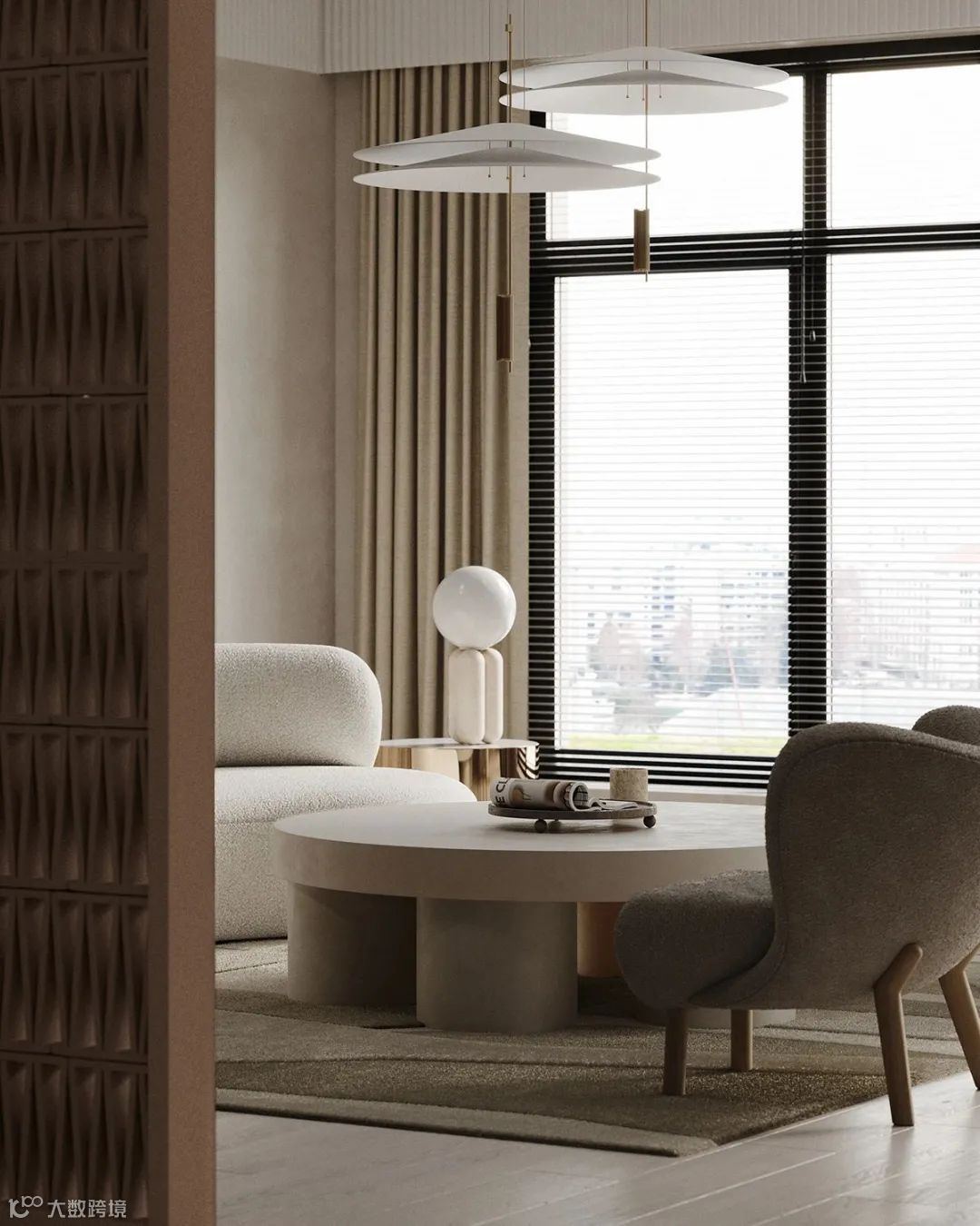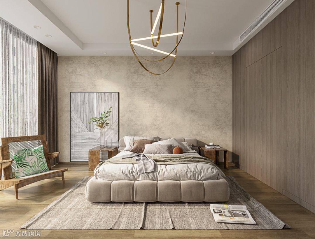 窗帘及装饰品使用质朴的亚麻纺织品让房间充满自然、原始的氛围,秉承“侘寂风”崇尚天然的理念,在细微处展现古朴的温度。