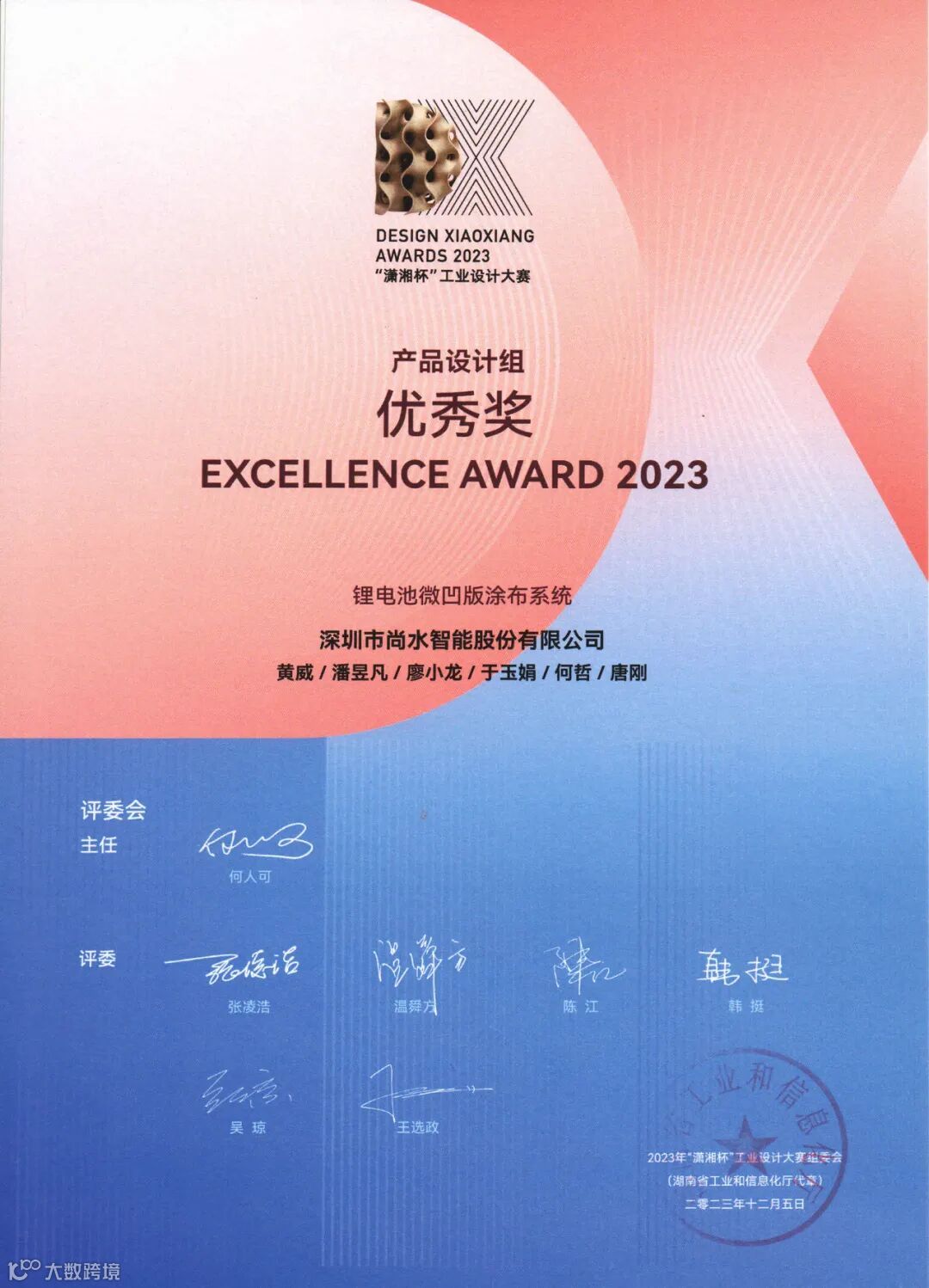 2023年“潇湘杯”工业设计大赛由湖南省省工信厅联合省教育厅、省科技厅、省财政厅共同主办。自今年6月启动以来,大赛受到社会广泛关注,共征集作5506件。尚水智能锂电池微凹版涂布系统获得大赛产品设计组优秀奖。