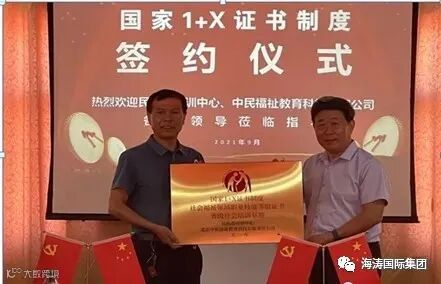 “1+X”证书是对国务院教育改革创新制度的贯彻落实,根据国家相关要求,“1+X”证书培训考试发证必须由第三方企业机构进行,经教育部核准备案,民政部投资组建的中民福祉教育有限责任公司就承担了此项重任,并与秦皇岛海涛国际集团签署了“1+X”证书省级社会培训基地,希望通过培训,为行业输送更多的优质人才。