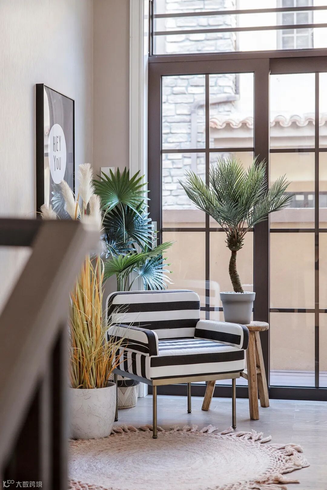 在三层露台,裸露的砖色墙面勾搭上室内的随性自然家具陈设,勾勒出度假般轻松的场景。