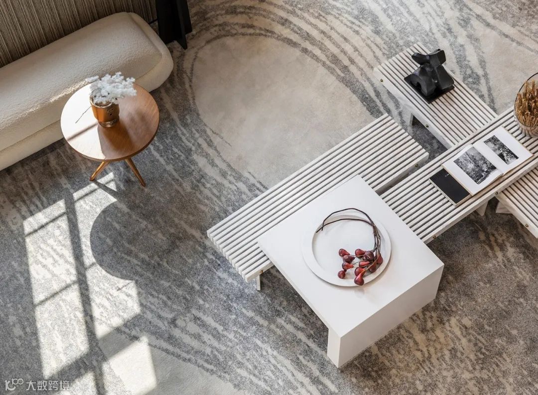 客厅茶几的灵感来源于万神庙的外部形状,该茶几一共由45根白色大理石组成,序列式的大理石组合给人正式,庄严的感受。