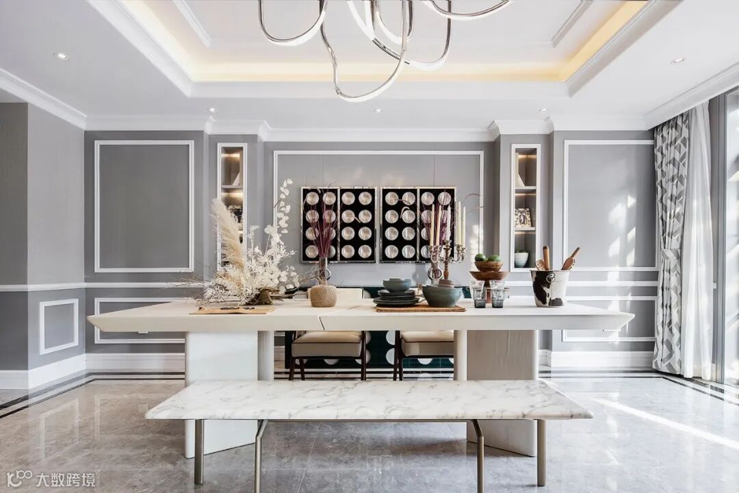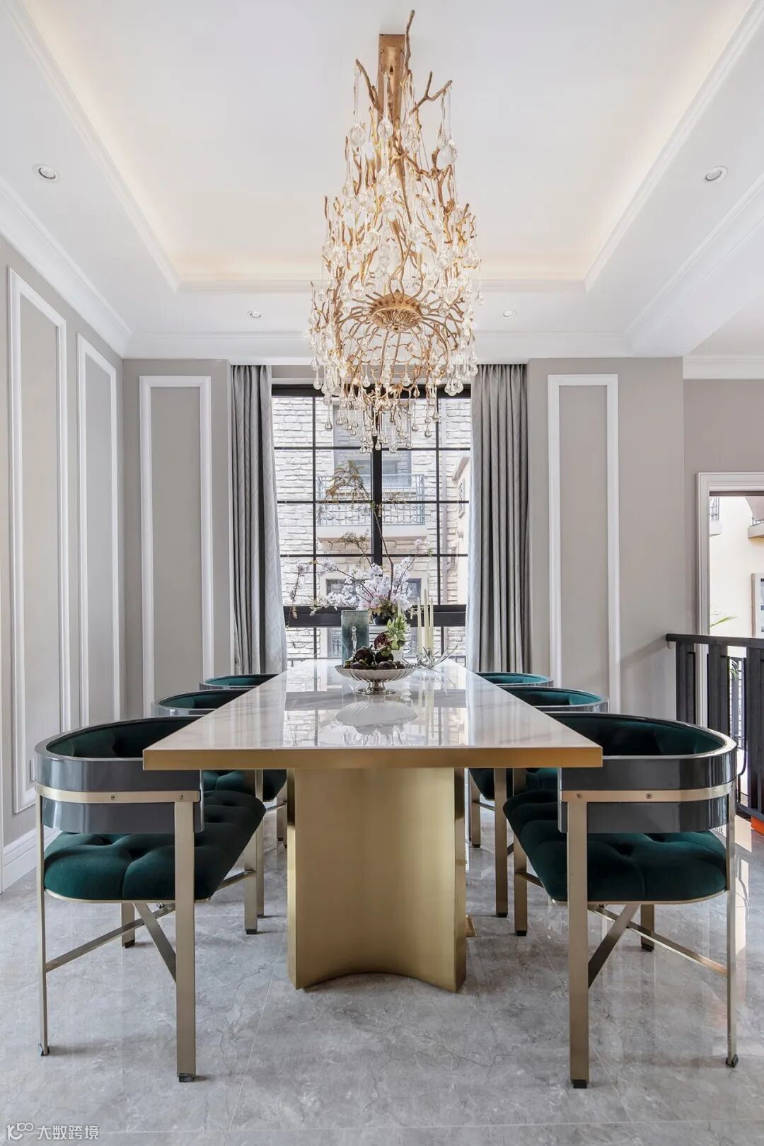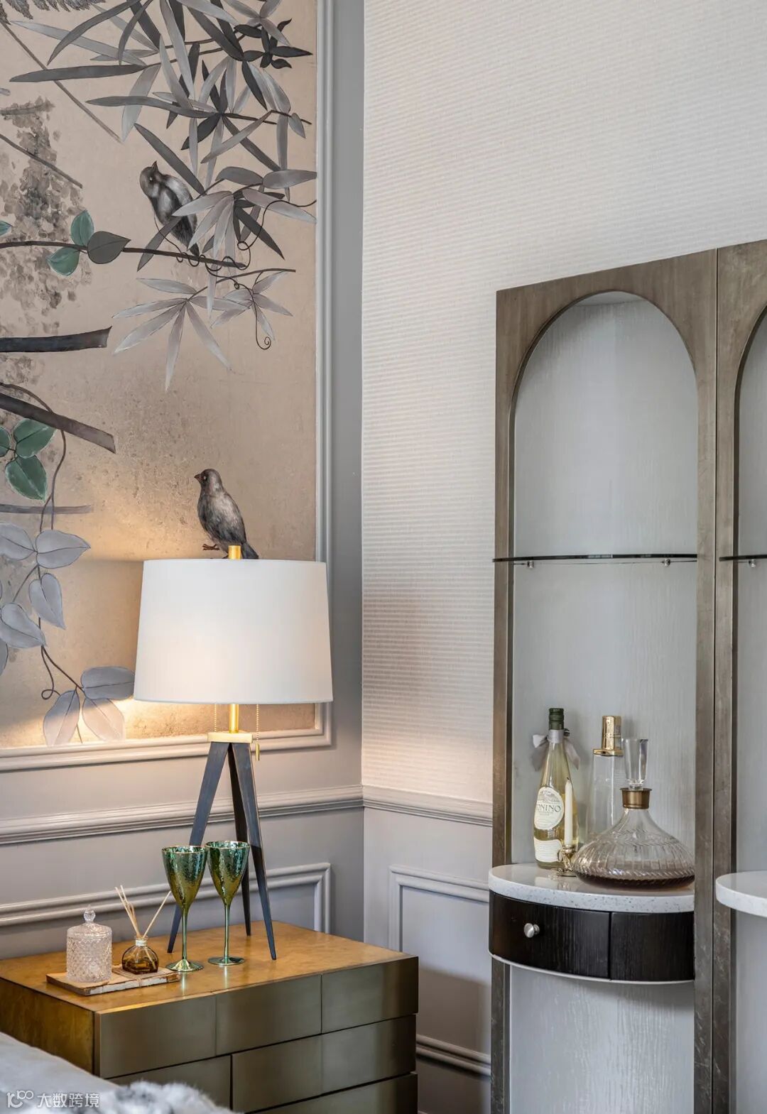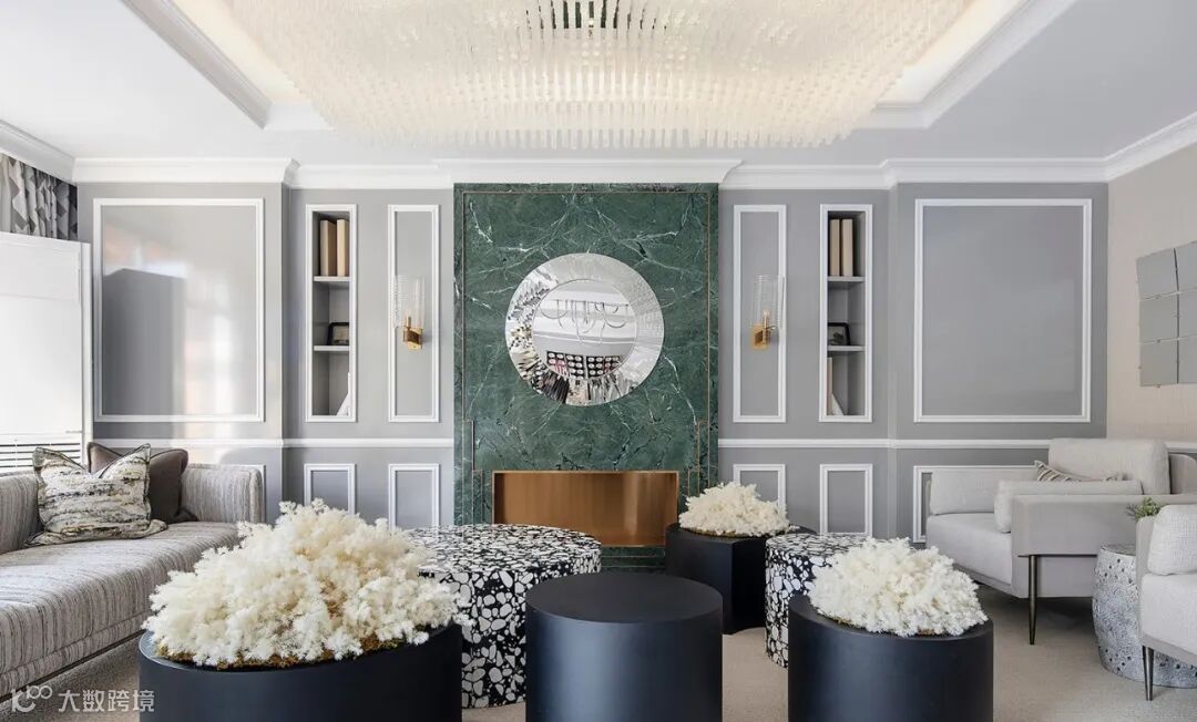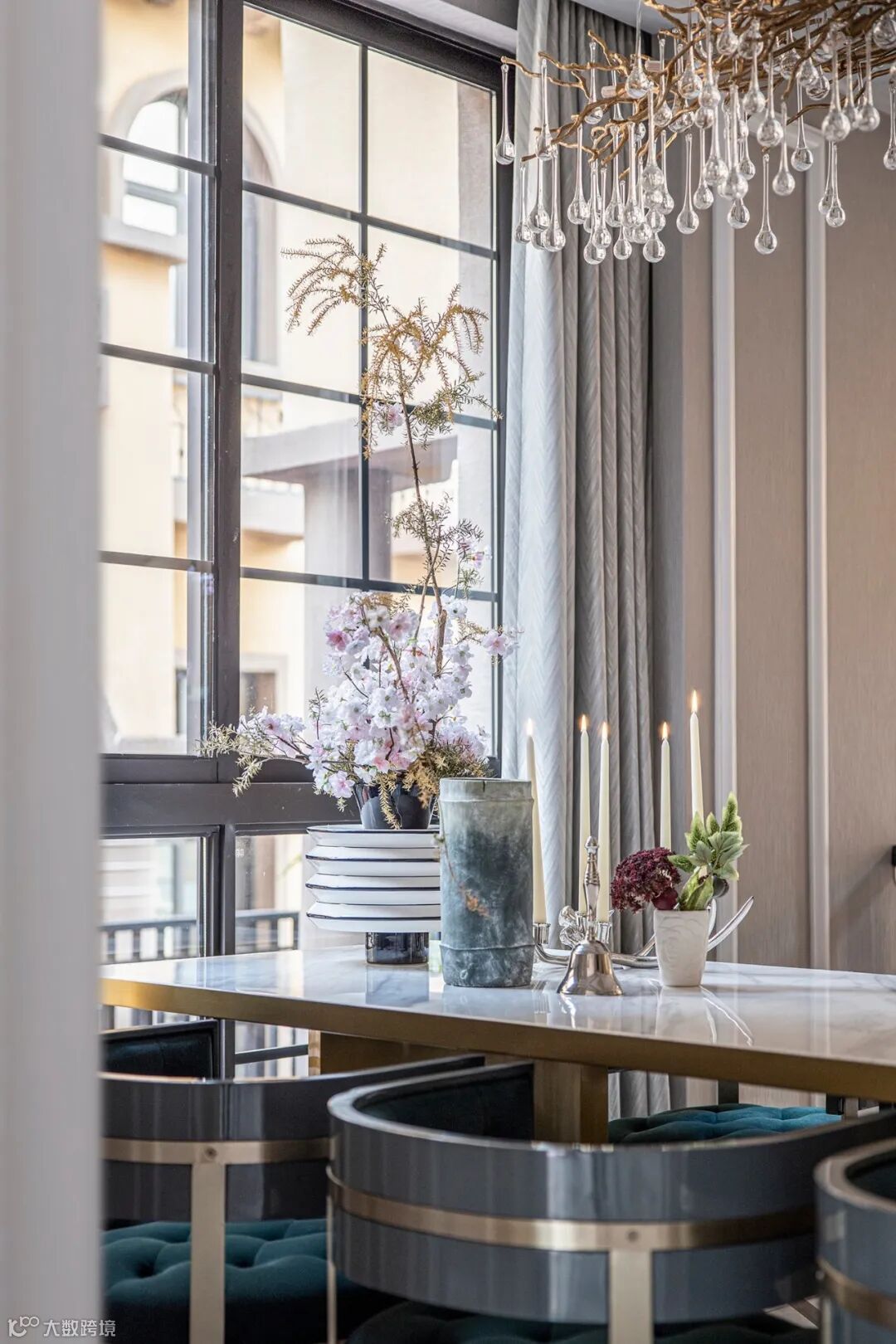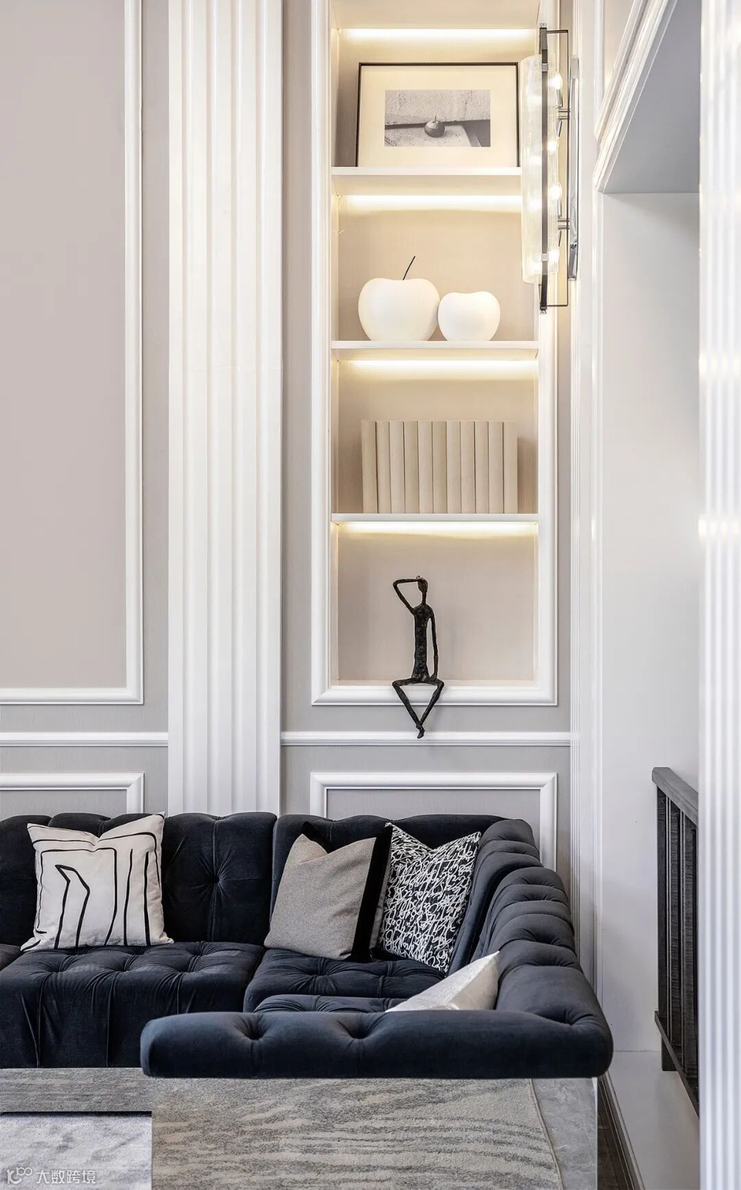 双层挑空的客厅空间,通过我们对家具尺寸与布局调整,延续了无可比拟的开阔感。被充分释放“自由”的客厅中,刻有凹槽的壁柱和丰富的壁龛无疑会唤起客人对奢华享受的实质憧憬,大量柔和的灰阶色在各个方面叠合,辅以豪华的材料色调 - 豪华的深色天鹅绒,白色大理石,古董黄铜,手工陶瓷,目之所及一气呵成,和平共处。