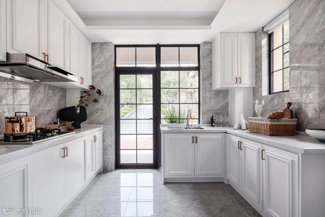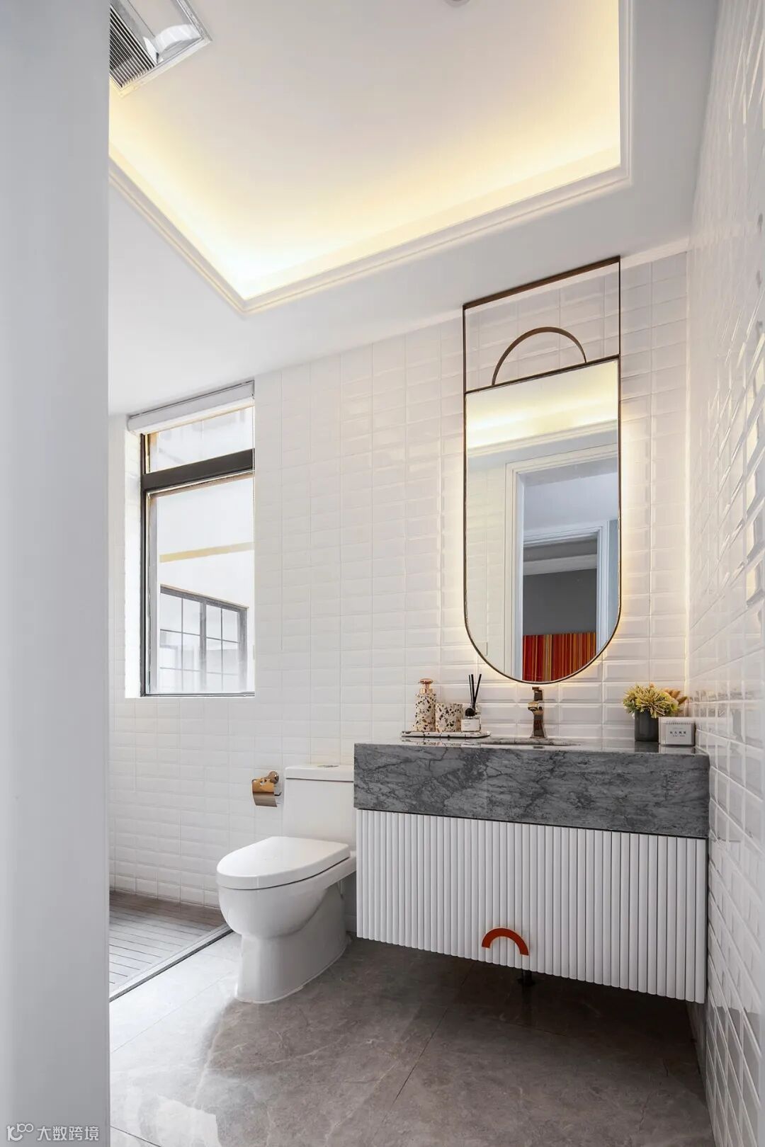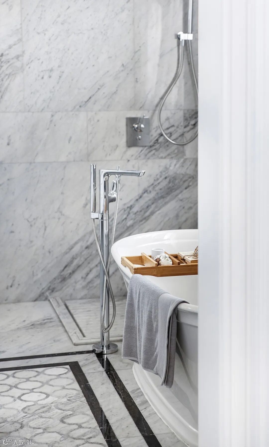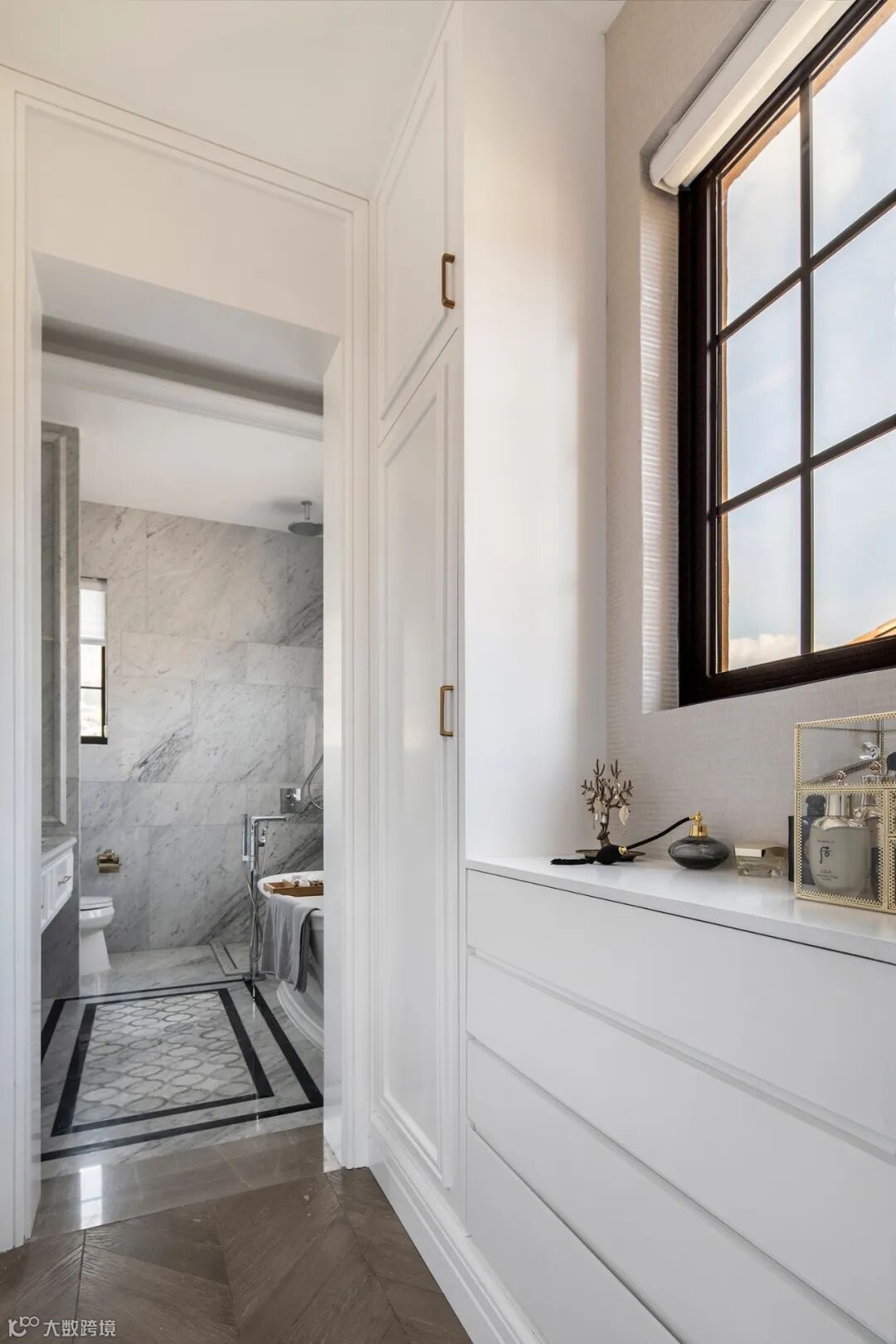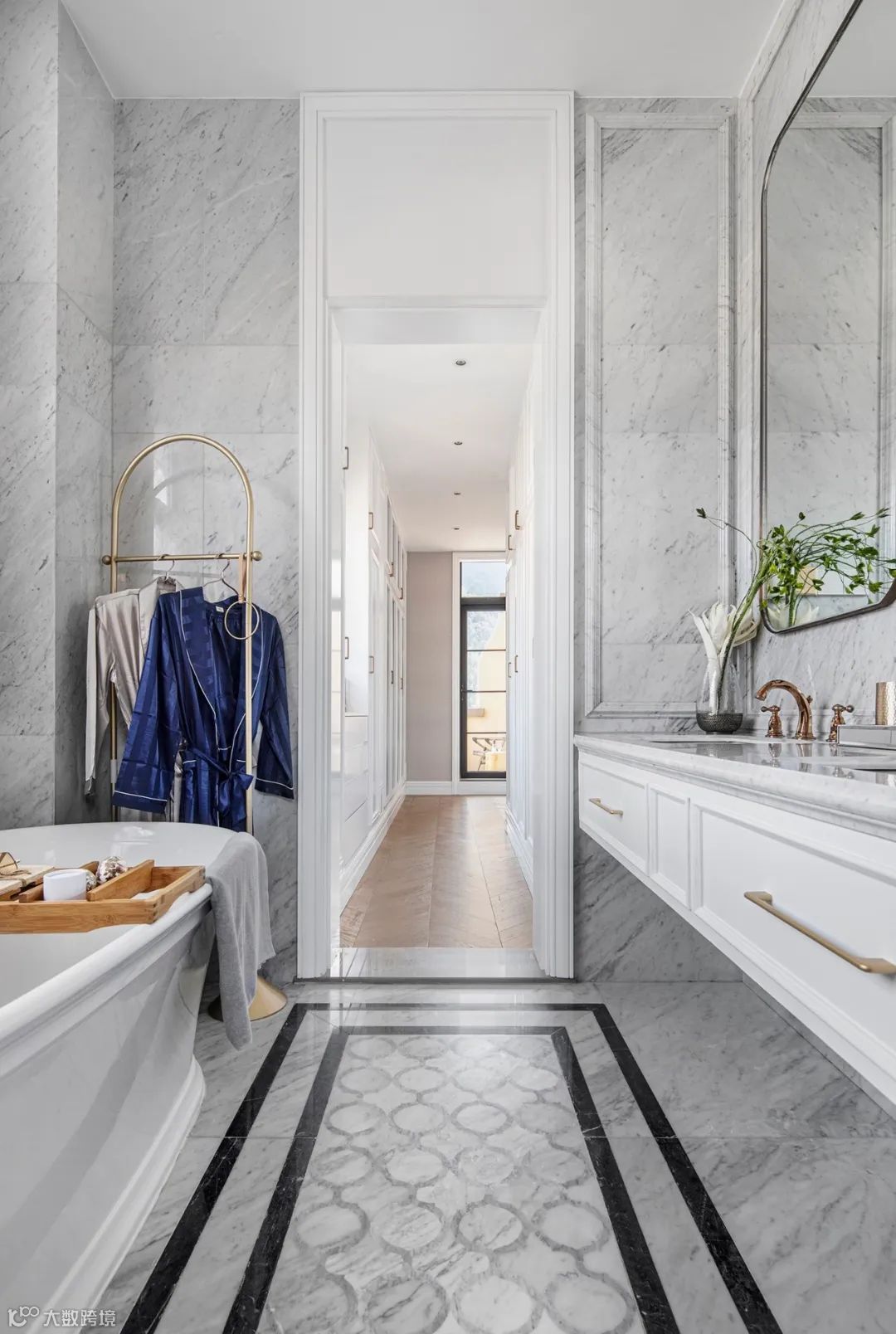 双层挑空的客厅空间,通过我们对家具尺寸与布局调整,延续了无可比拟的开阔感。被充分释放“自由”的客厅中,刻有凹槽的壁柱和丰富的壁龛无疑会唤起客人对奢华享受的实质憧憬,大量柔和的灰阶色在各个方面叠合,辅以豪华的材料色调 - 豪华的深色天鹅绒,白色大理石,古董黄铜,手工陶瓷,目之所及一气呵成,和平共处。