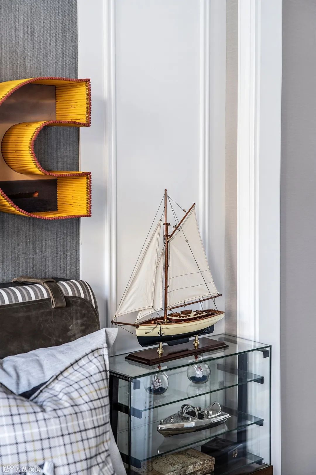 桌子上放置着加勒比海盗中的“珍珠号”模型,及小主人制作轮船的手工工具,床右侧的玻璃展柜放置着小主人珍爱的轮船模型。