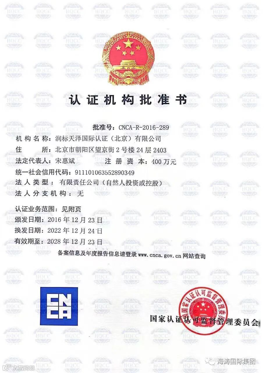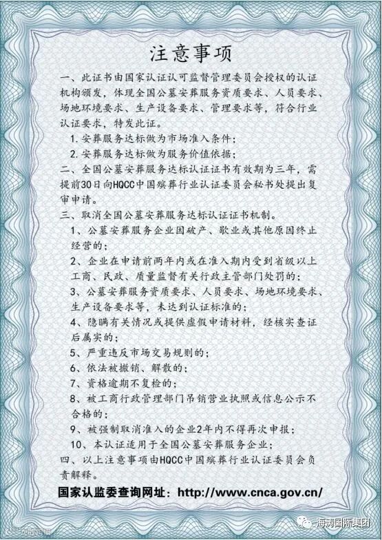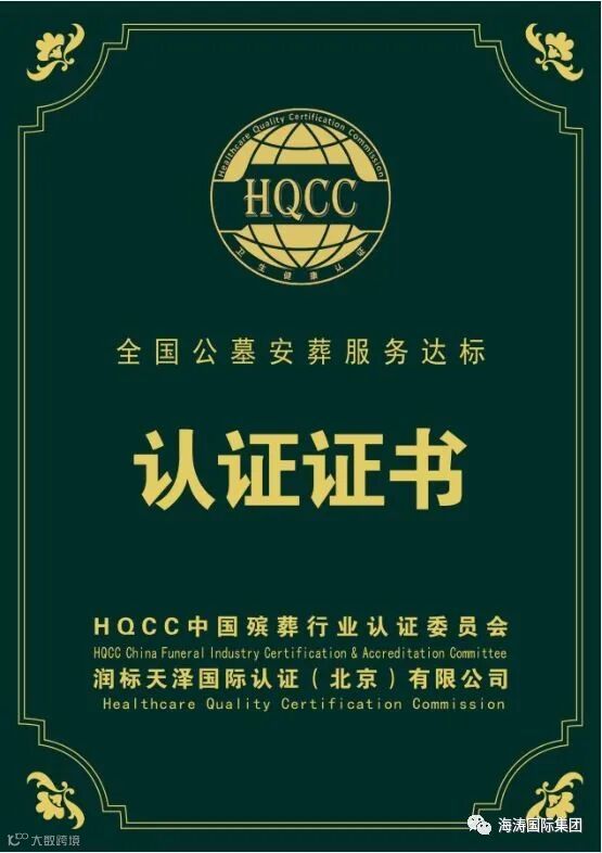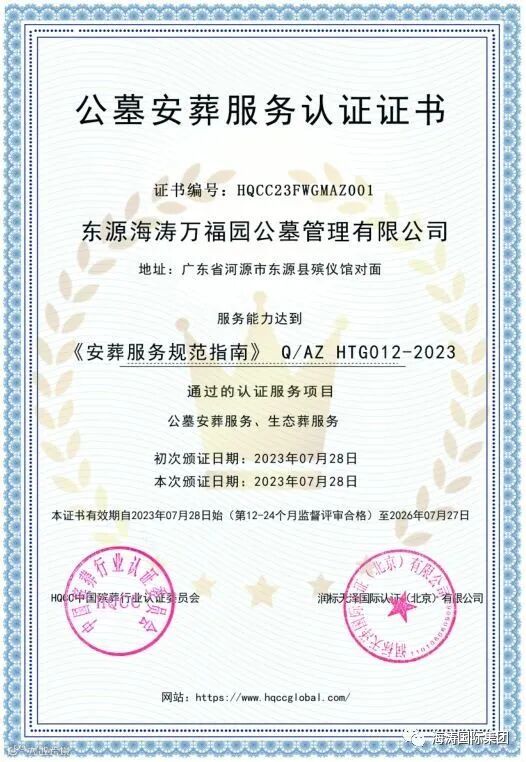 海涛国际集团通过VIE架构组建的成员公司东源海涛万福园公墓管理有限公司,经认证公司认证,安葬服务达标。