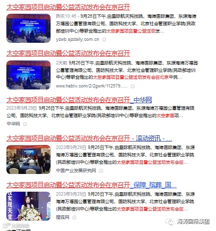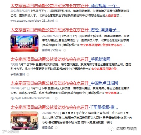 | 太空家园项目启动暨公益活动发布会在京召开 | 千龙网 | https://china.qianlong.com/2023/0929/8119489.shtml |