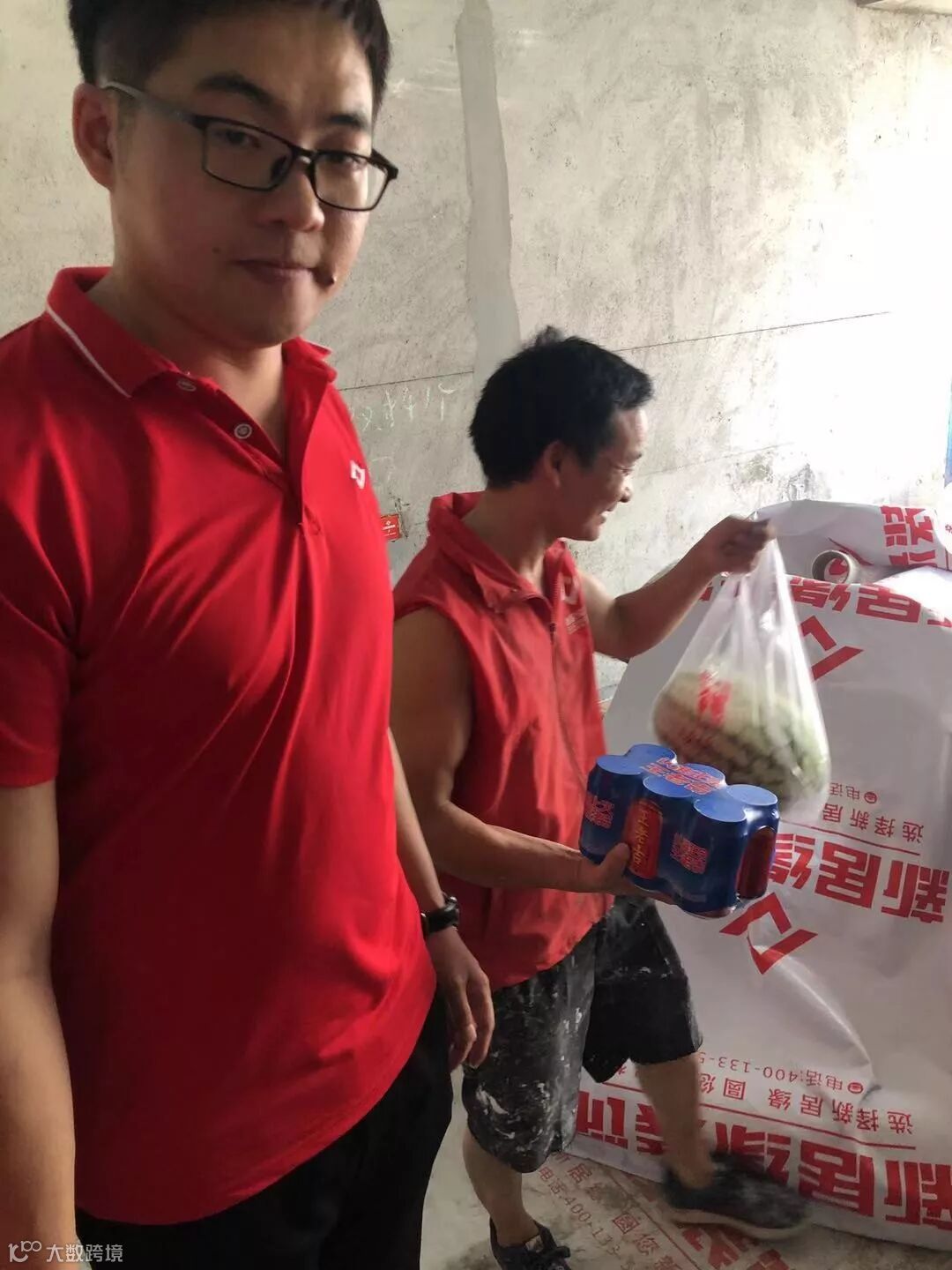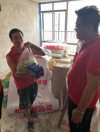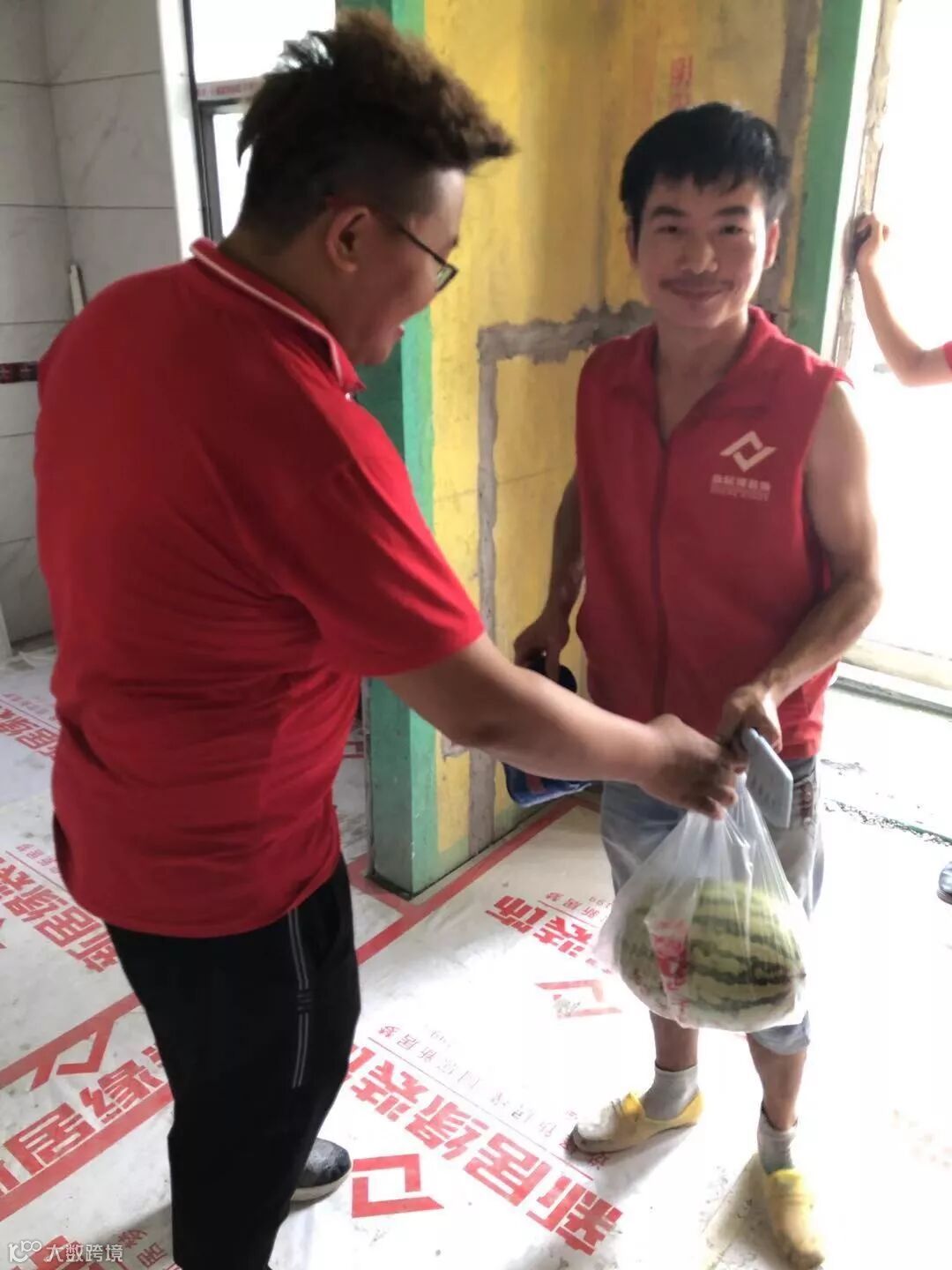 装修师傅们在没有空调和电扇的环境里一丝不苟,挥汗如雨,因为不能让沙土漫飞影响工程质量,工作服湿了又干,干了又湿,连紧握着的工具都在释放着热量,这一切在炙烤天气里的坚持,就是为了圆业主尽快入住幸福新家的期盼,师傅您辛苦了!高温来袭,夏送清凉!潘经理和陈经理把一份份心意传送到装修师傅们的手中,希望这一份心意能在这个炎热的夏日,为装修师傅们带来丝丝清凉。