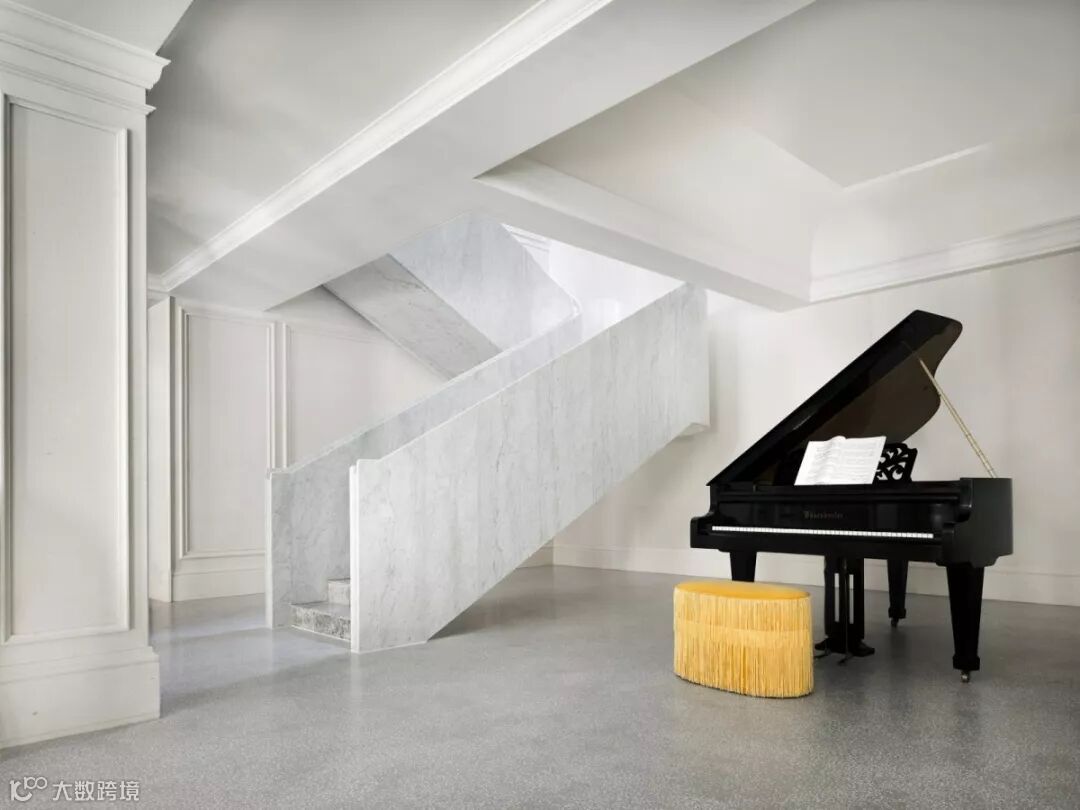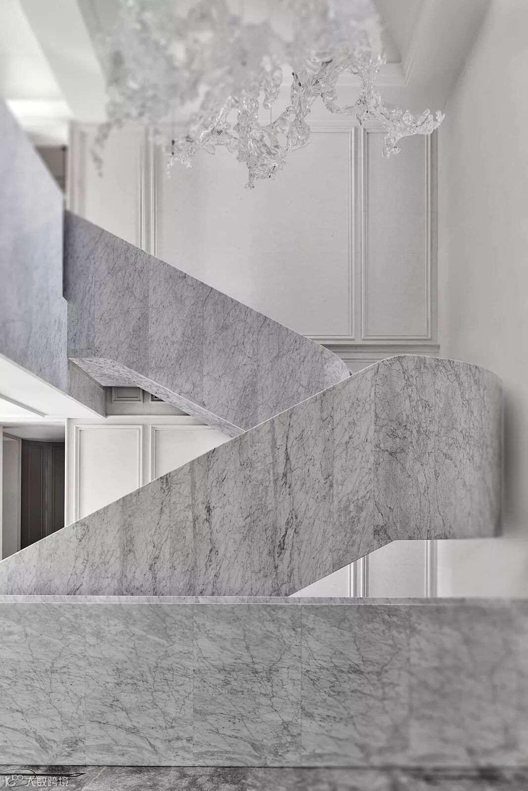 设计师将对“线”的艺术提炼蕴藏于空间的功能诉求之中:主入口,经过特别改造的浅灰色大理石楼梯取代原本户型中的对称双楼梯,硬朗冷峻的折线融汇上下空间与动线,获得极富力量感的平衡。