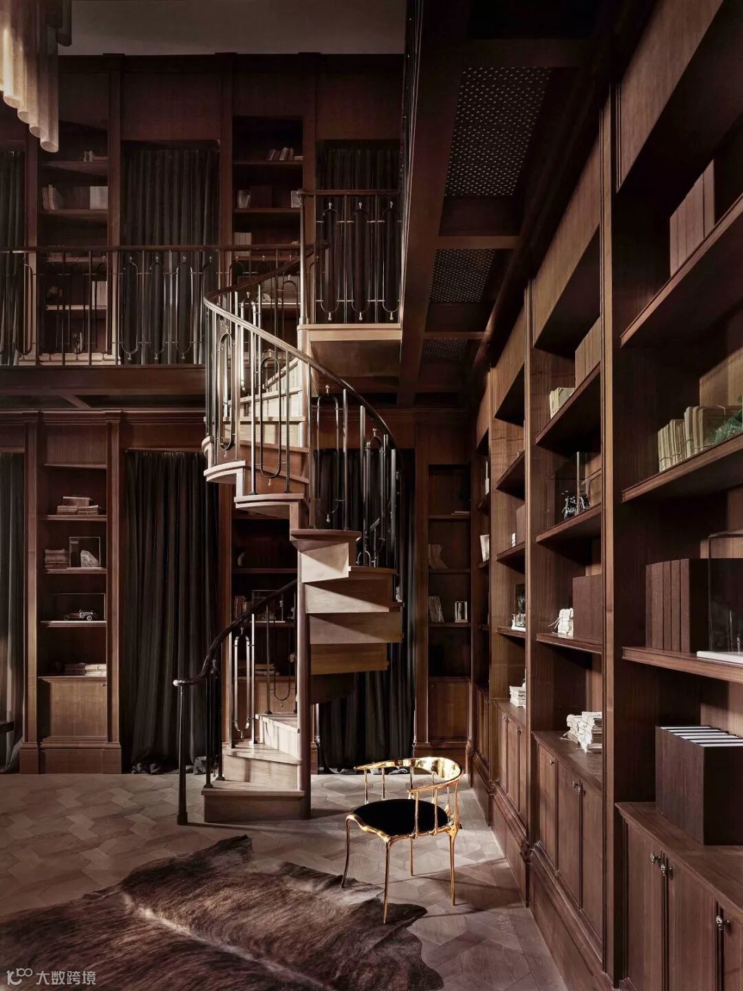 铁艺楼梯的螺旋被四向垂直温厚的暗木纹书架所环绕,向心线是对心灵哲思与自我原点的抽象回归。