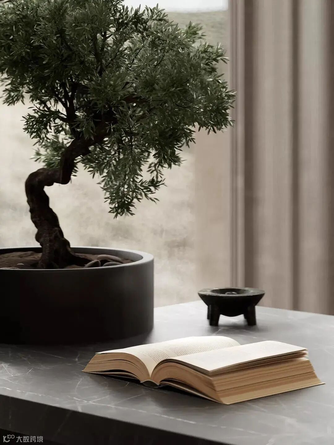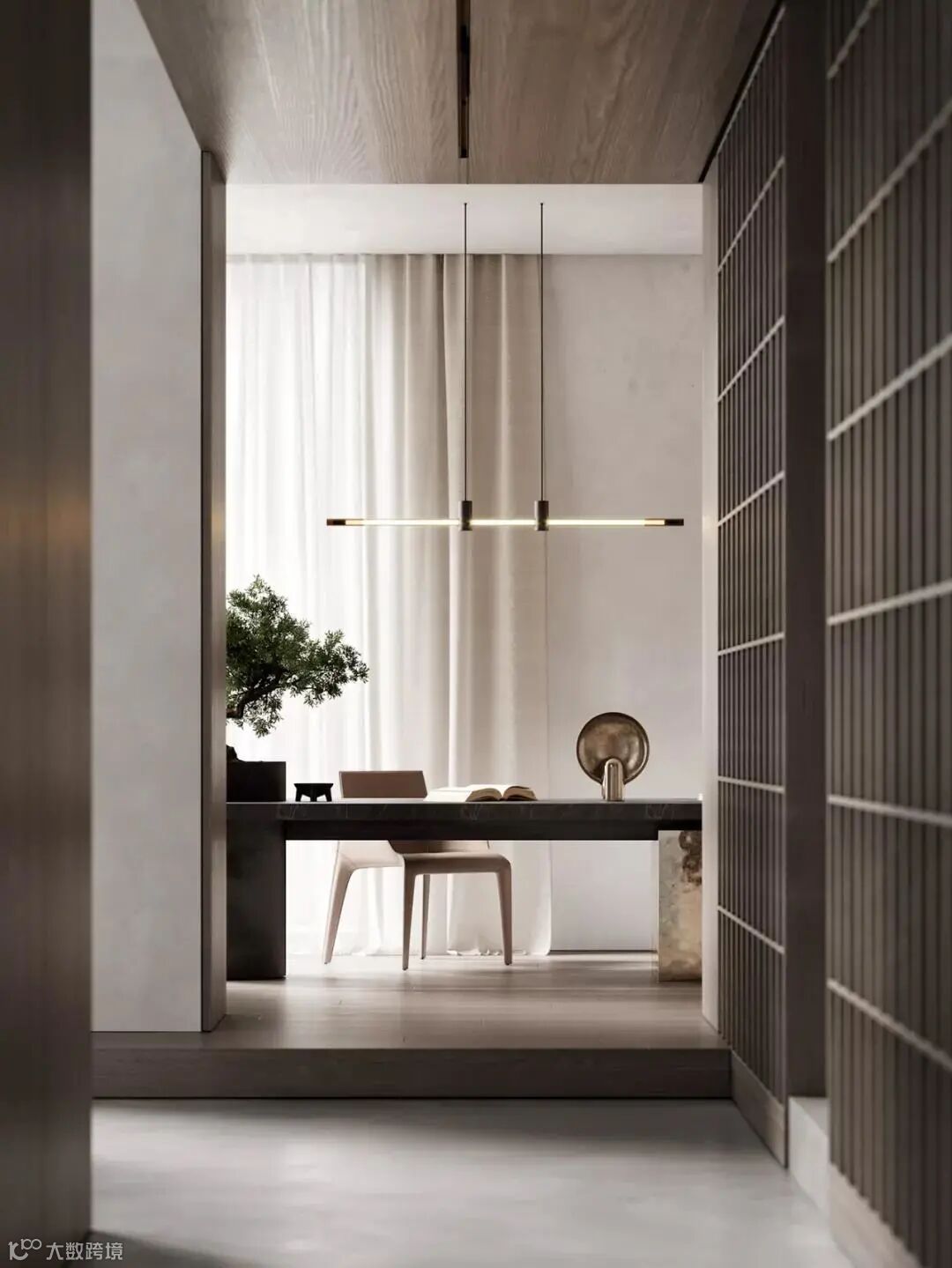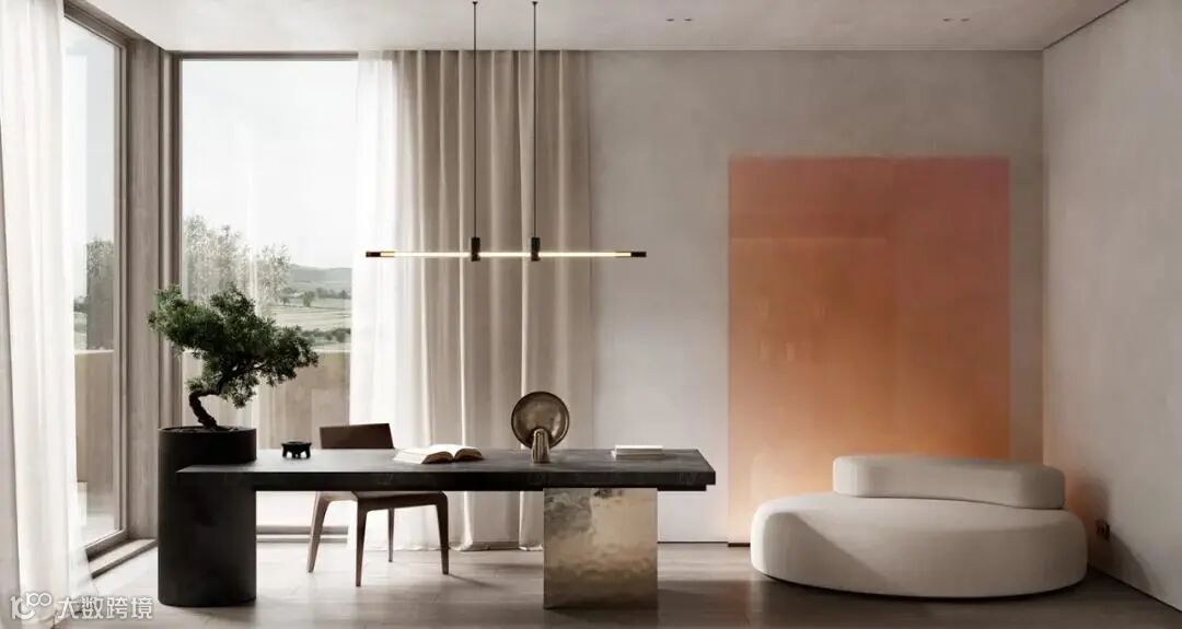书房依旧延续极简的设计风格,流畅的线条与柔和的色调,让屋主能够更加专注的沉浸于学习与工作之中。盆景与书桌融为一体,展现了空间中的生活美学,让人远离城市的喧嚣。