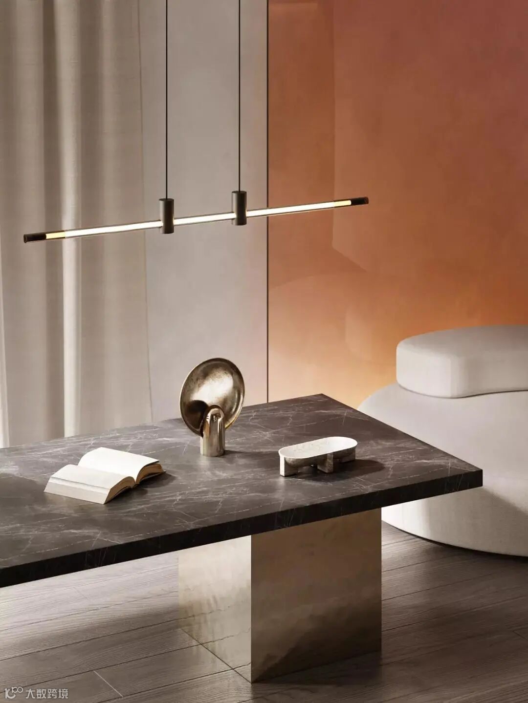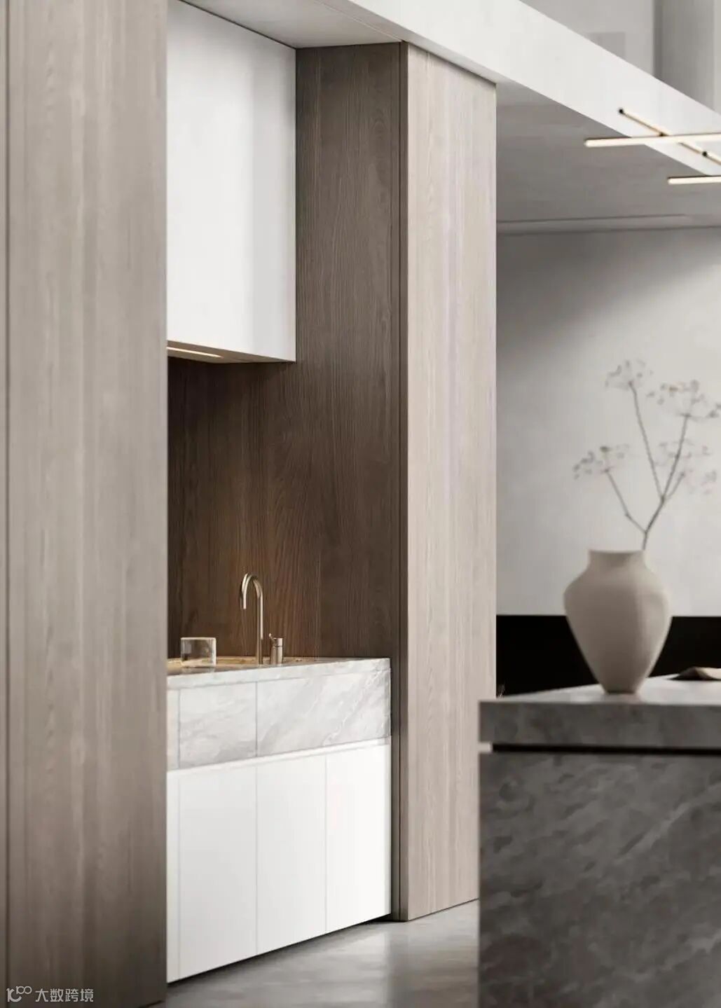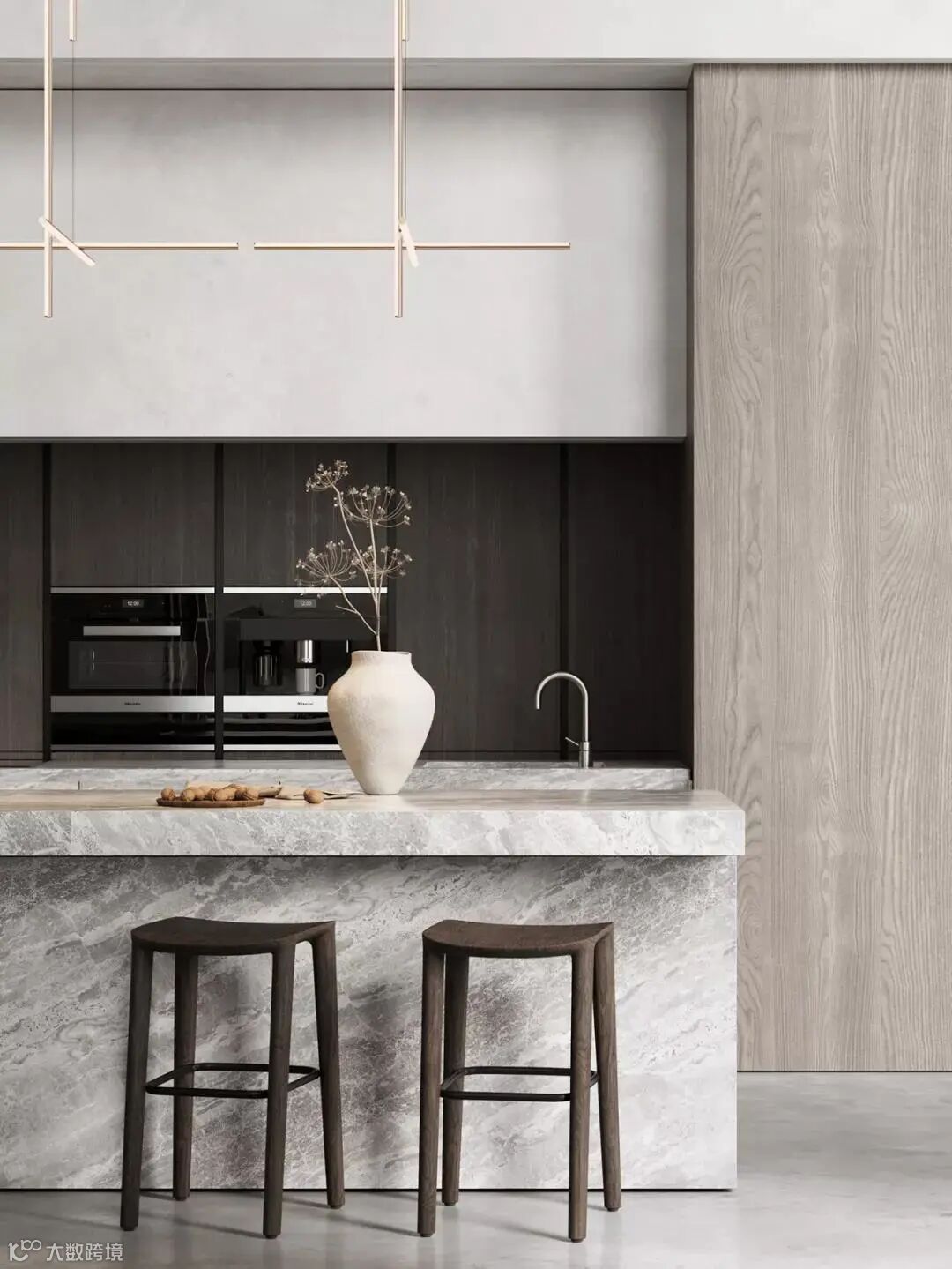 厨房位于客厅旁边,浅灰色的大理石中岛台搭配深色座椅,形成了色彩上的对比。中岛台上方的吊灯,设计简洁,交错的灯管展现了现代极简主义下的几何美感,后方的木制橱柜增加了厨房的储物空间,美观性与实用性兼具。