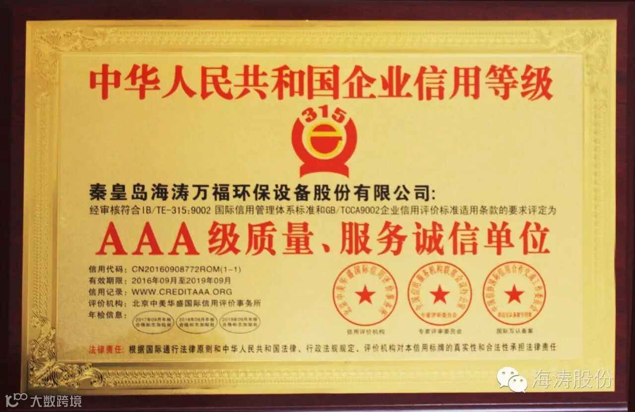导读:秦皇岛海涛股份被评为AAA级诚信经营示范单位、AAA级质量、服务诚信单位