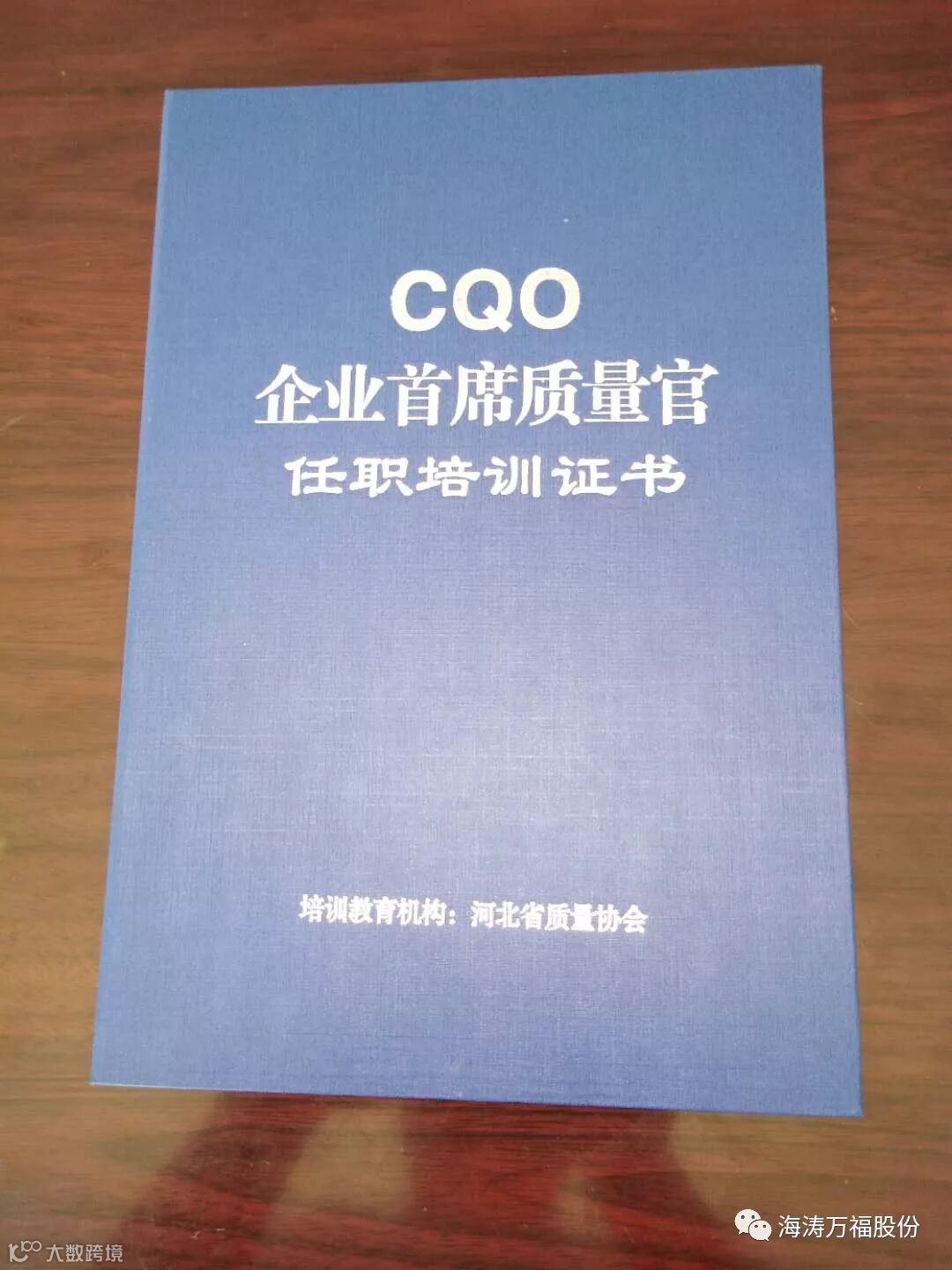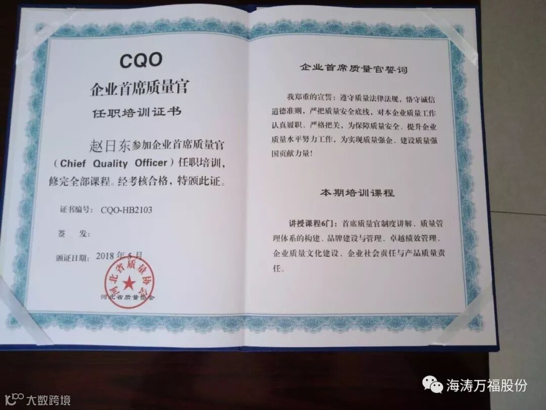 本次交流会议中,秦皇岛海涛集团公司赵日东副总经理以优异的成绩获得企业首席质量官任职培训证书。