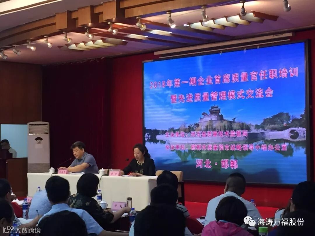2018年5月29日,河北省质量技术监督局在邯郸邯钢宾馆举办2018年第一期企业首席质量官任职培训暨先进质量管理模式交流会,总共参加培训人数达到380人。秦皇岛海涛集团公司副总经理赵日东、安全生产质检部姜鹏参加了此次培训会议。