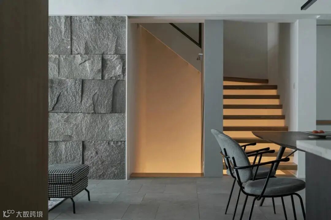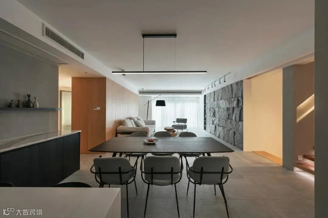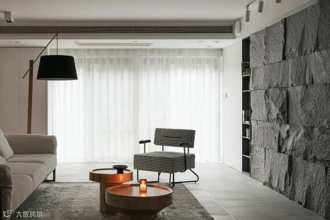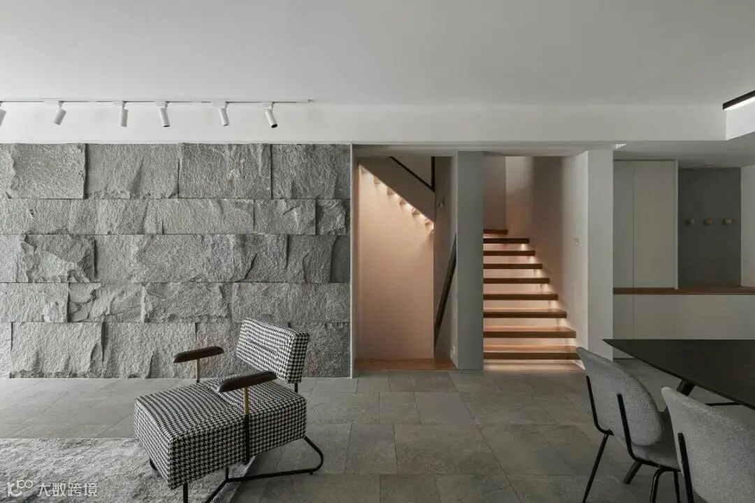 天然的材质总是充满了温度,依靠独特的纹理和质感,让空间充满原始质朴的能量。不规则原石墙面,铺展开亲近自然的真实感官,给予空间张力与生命力;配合大面积落地窗引入的自然光,糅合交织出空间光影的韵律,通透明亮。