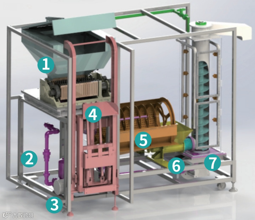 ①破碎机②污水泵③液压站④提升机⑤滚筒式脱盐去油机⑥强制进料器⑦螺旋脱水机