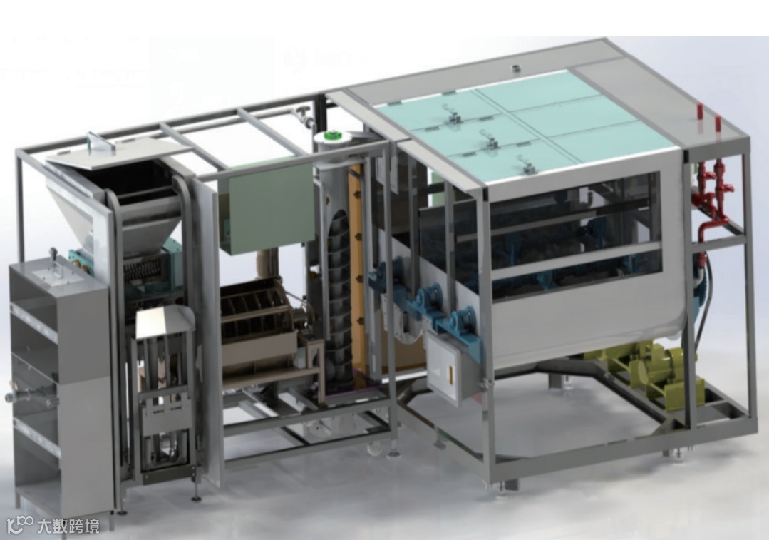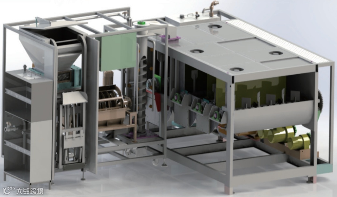 预处理系统的运行时间预计半小时可处理完 500Kg的有机垃圾。物料以桶装的形式挂靠在“提升机”上,经过“提升机”将物料倒入“破碎机”料斗内进行破碎处理,破碎后的物料经过“滚筒式脱盐去油机”进行水洗处理,水洗后的物料经过“强制进料器”进入立式“螺旋脱水机”进行脱水处理,完成后的物料进入“有机垃圾生化处理系统”。