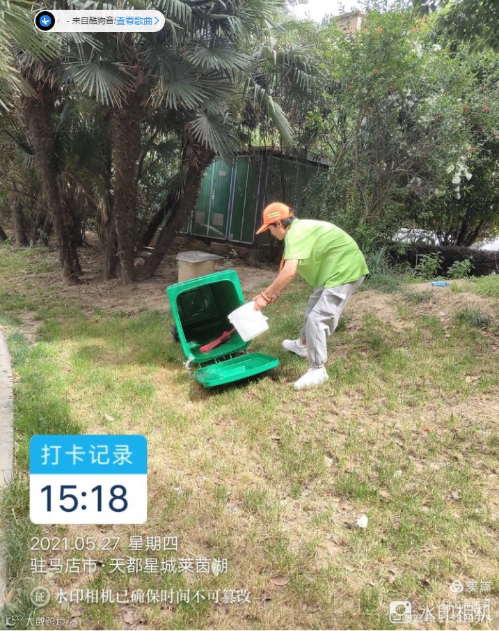 现场工作人员,每天早晚使用除臭剂对垃圾桶进行喷洒。