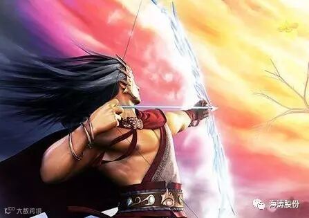 白龙出水,龙卷风起,与宓妃并骑驰骋的羿见百姓又要造殃,返身一箭,射中白龙左目,那河伯负痛,捂住伤口窜入河底。