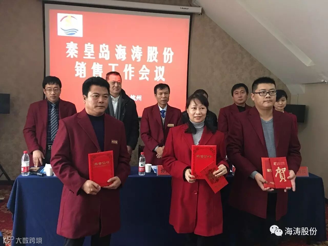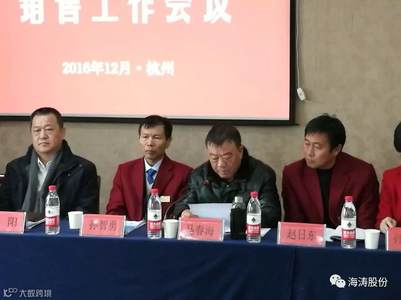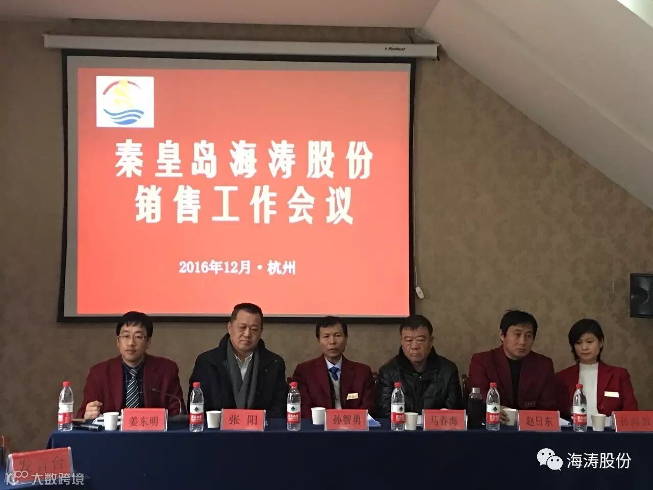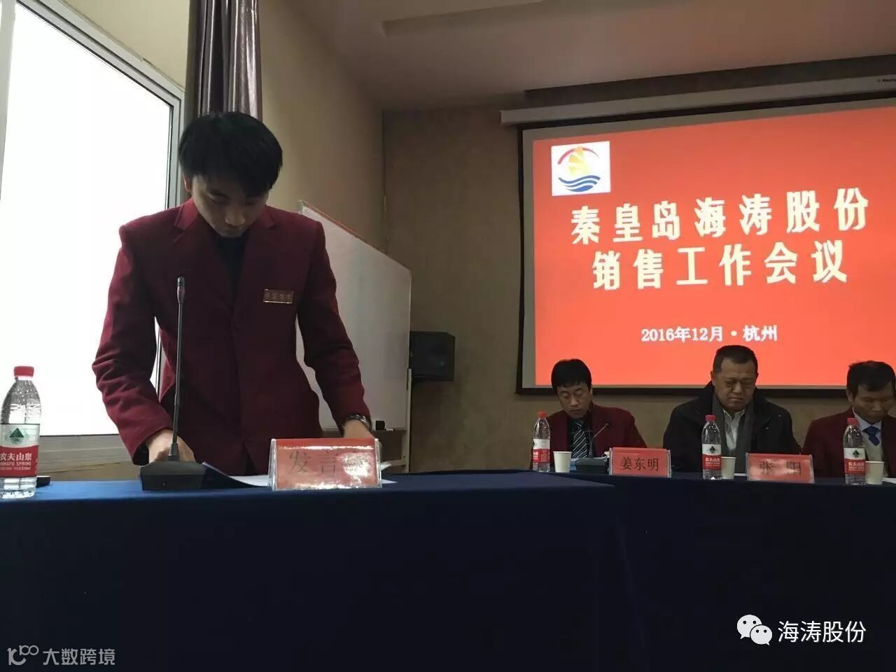 2016年12月25日,秦皇岛海涛股份销售工作会议在杭州市萧山区召开.孙智勇董事长、董事张阳、党支部书记马春海、副总经理孙海波、副总经理姜东明、副总经理赵日东、销售部经理杨阳、销售部副经理冯博、国际业务部经理冯治帼、市场运营部经理李曼、销售部业务员韩燕燕等,及各分公司代表等出席了本次会议.