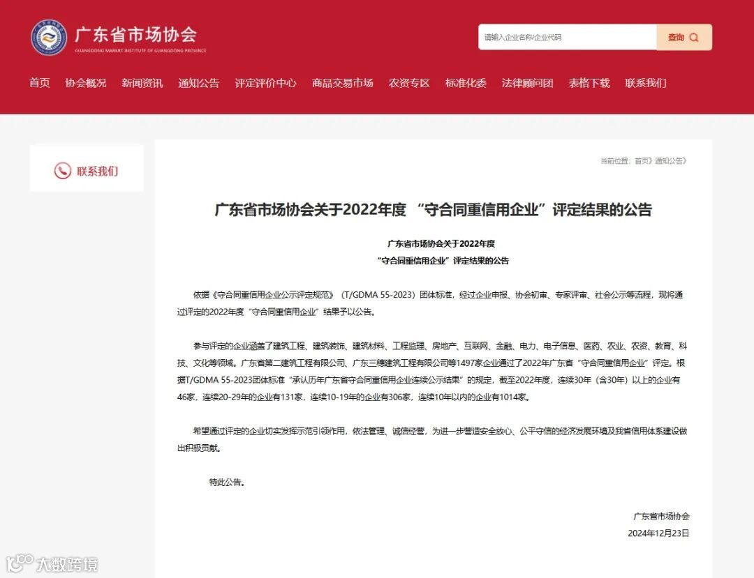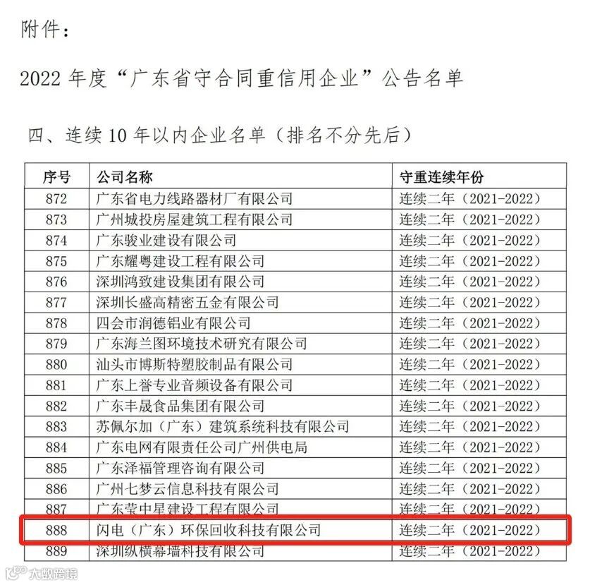 近日,我们迎来了广东省市场协会关于2022年度“守合同重信用企业”评定结果的喜讯。闪电(广东)环保回收科技有限公司,荣幸地连续第二年(2021-2022)被授予“守合同重信用企业”的荣誉称号。