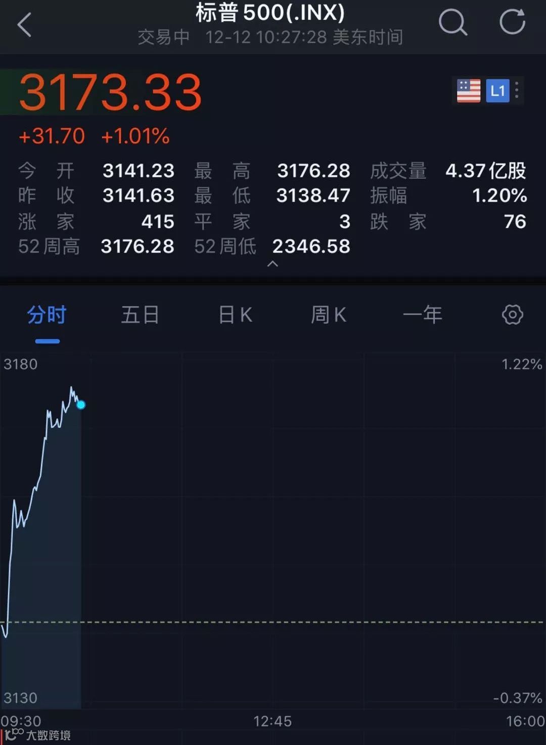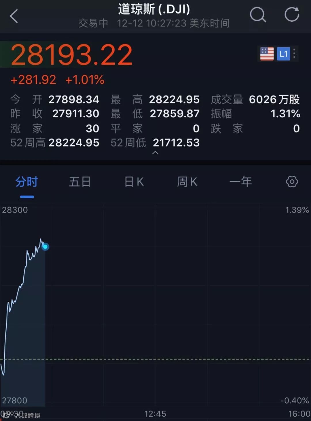 北京时间12月12日深夜,美股开盘时间,美股三大指数一下就直线上涨,全部创下历史新高,其中道指盘中直线涨超300点!