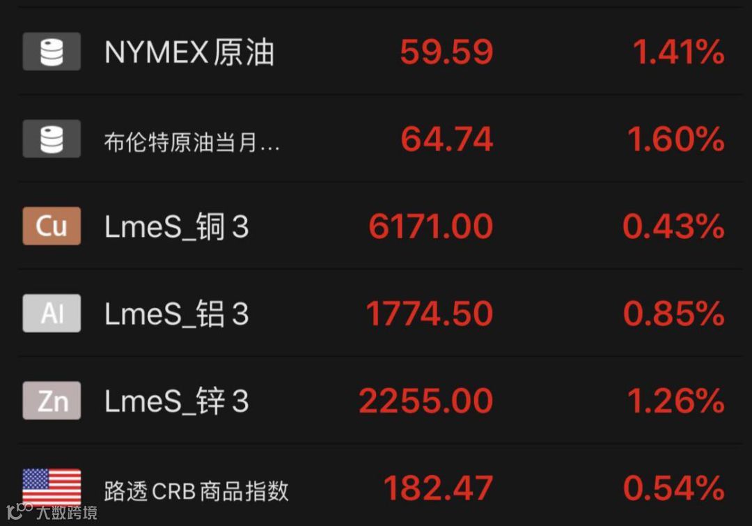 全球主要大宗商品也全线飙升。