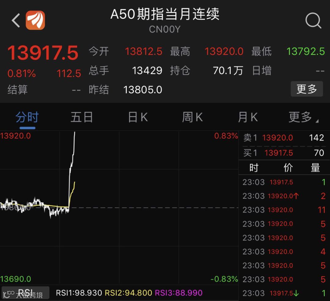接着A50反应也相当剧烈,出现直线拉升的行情,涨幅达112点,也未见止涨迹象。