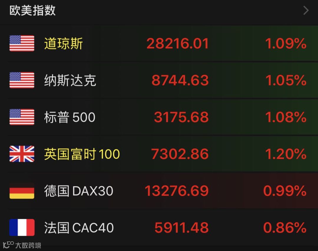 欧美股市更是强势表演,欧洲主要股指全线飘红。