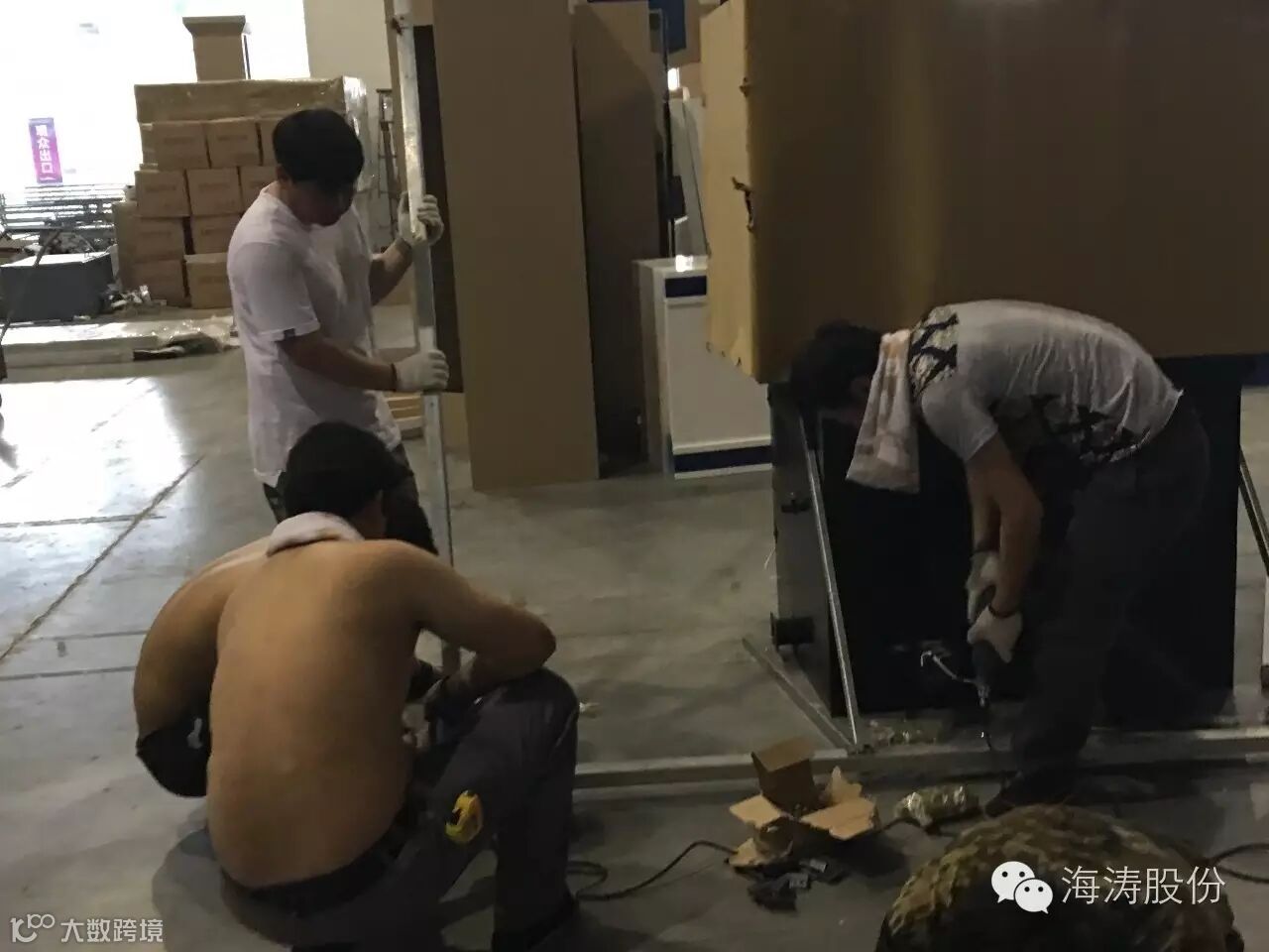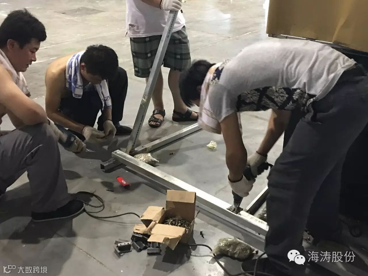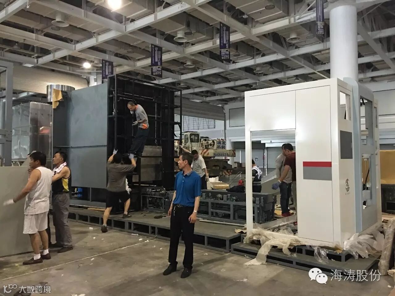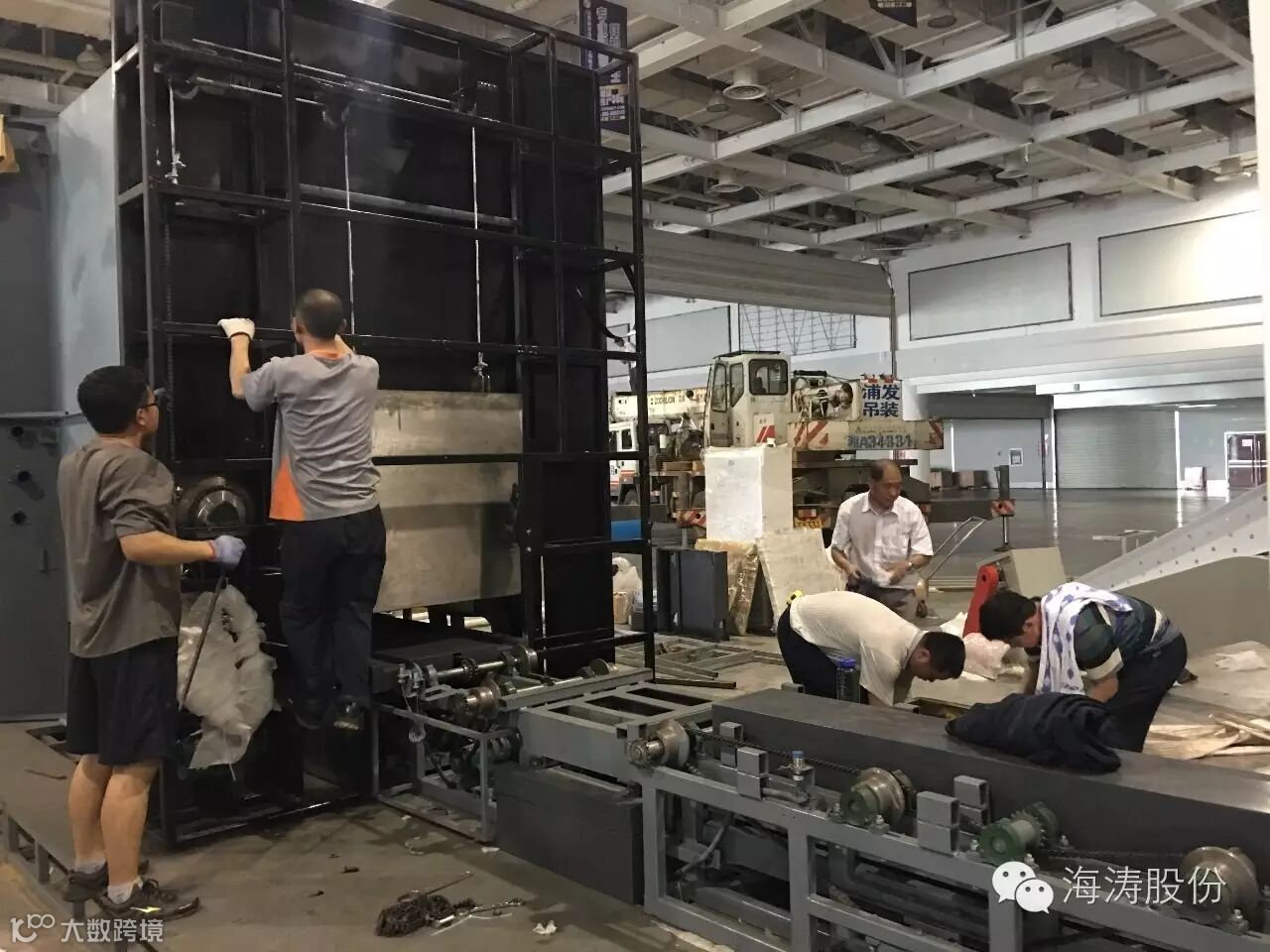正午12:00整,我们正式步入了会展大厅,各部门分工明确,测量场地、规划部署、运送安装都在有条不紊的进行着.空旷的会场内,代表着工程进度紧张进行的声音交错不息,在这些声音中,偶尔也会听到一阵阵爽朗的笑声,这笑声夹杂着汗水,也夹杂着海涛人的热情.