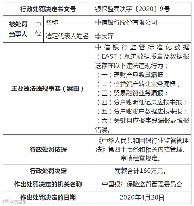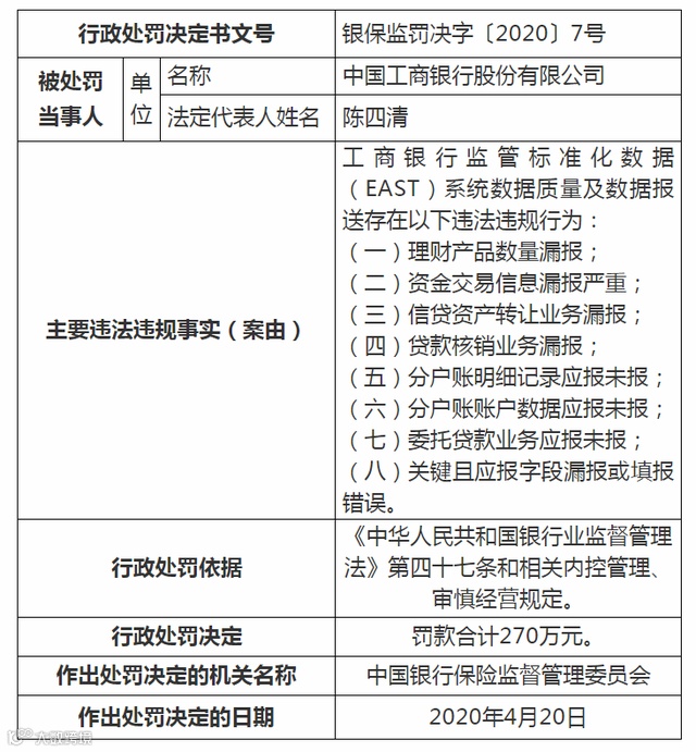 导读:5月9日,银保监会公布行政处罚信息公开表显示,包括国有六大行在内的8家银行,因监管标准化数据(EAST)系统数据质量及报送存在违法违规行为受罚,罚款金额共1770万元。