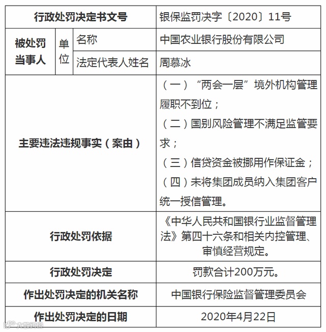 中国农业银行股份有限公司收到两份行政处罚决定,在银保监罚决字〔2020〕11号文件中显示其主要违法违规事实(案由)有: